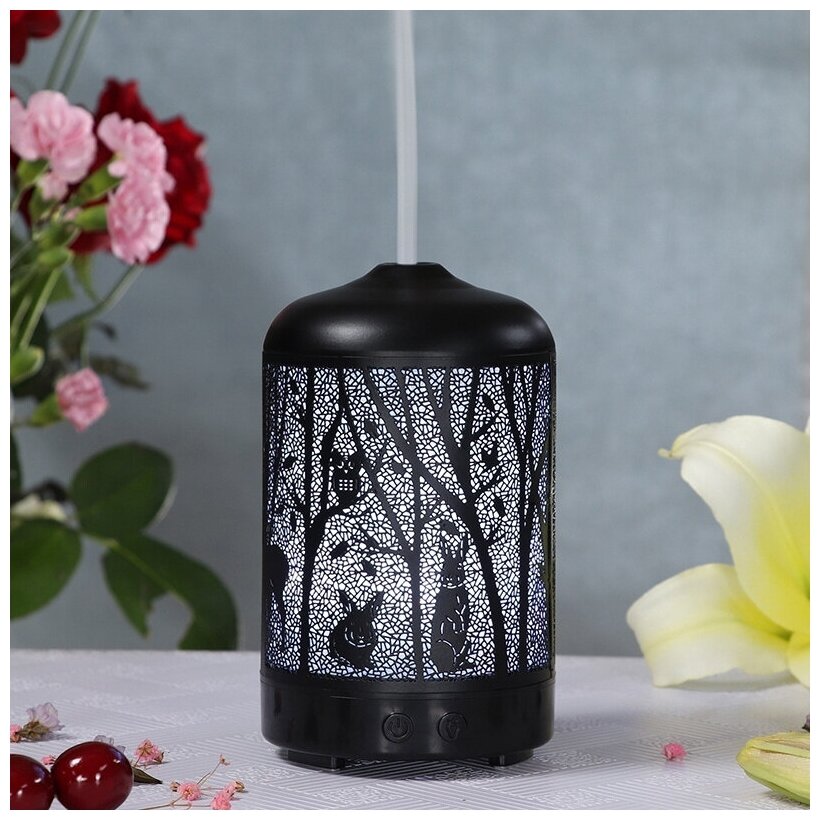 Air humidifier, aroma diffuser for essential oils with light, 7 glow modes, for apartment, office, with forest pattern