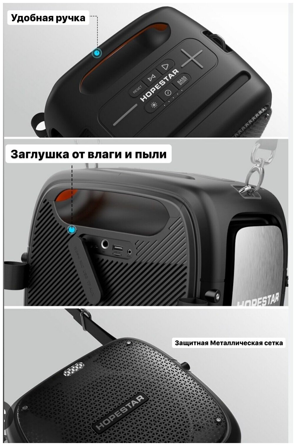 Type: 2.1, total power: 80 W, wireless connection: Bluetooth, connectors and interfaces: USB Type-A for flash drive, audio input mini jack 3.5 mm, microphone input - jack 6.3 mm