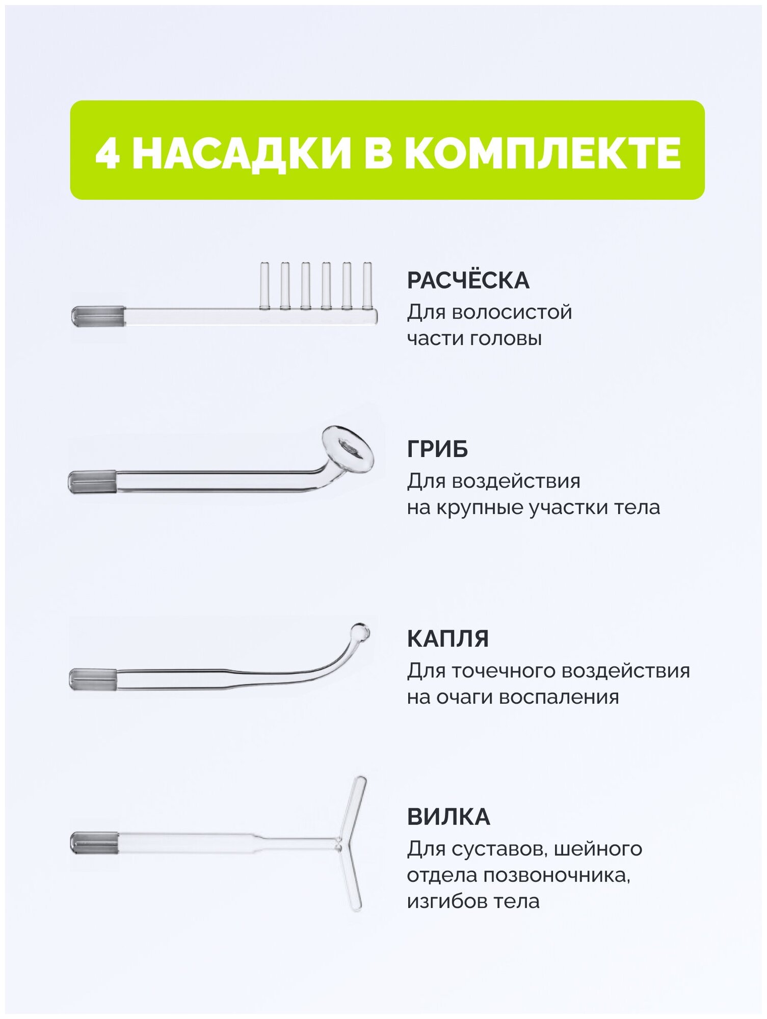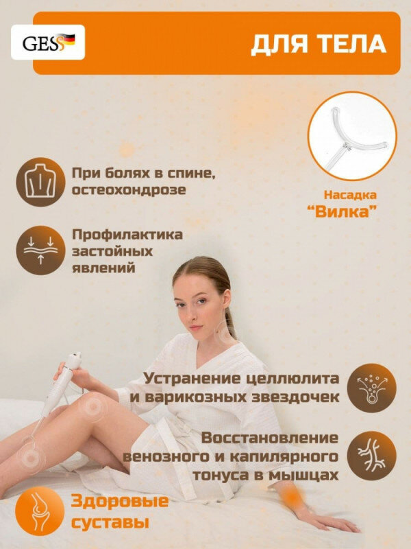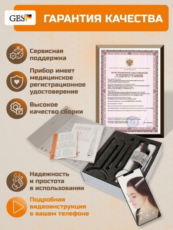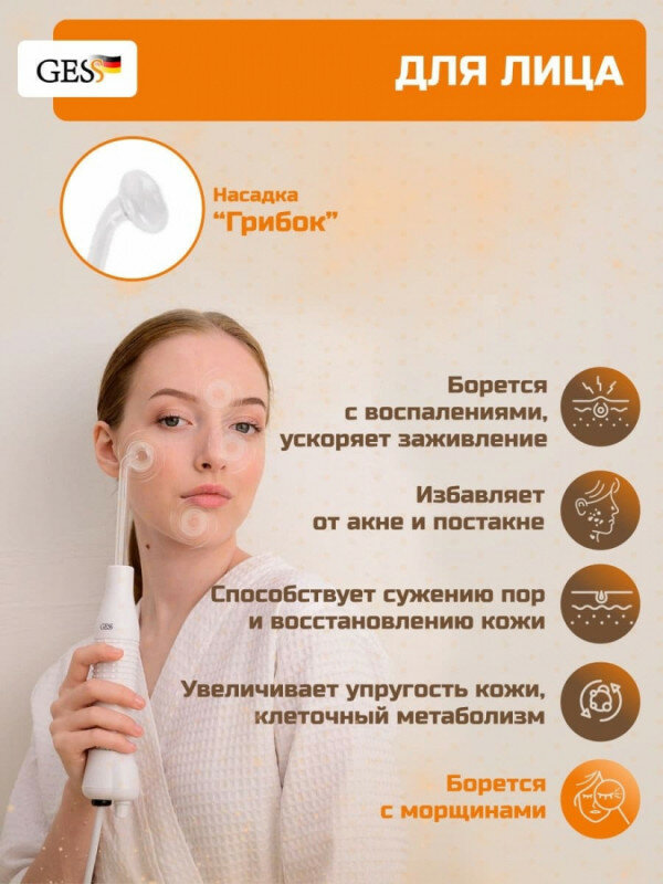 Type: darsonval, purpose: anti-aging care, anti-cellulite care, acne treatment, improvement of hair condition, principle of operation: darsonvalization, effect: increase skin elasticity, even complexion, improve blood supply