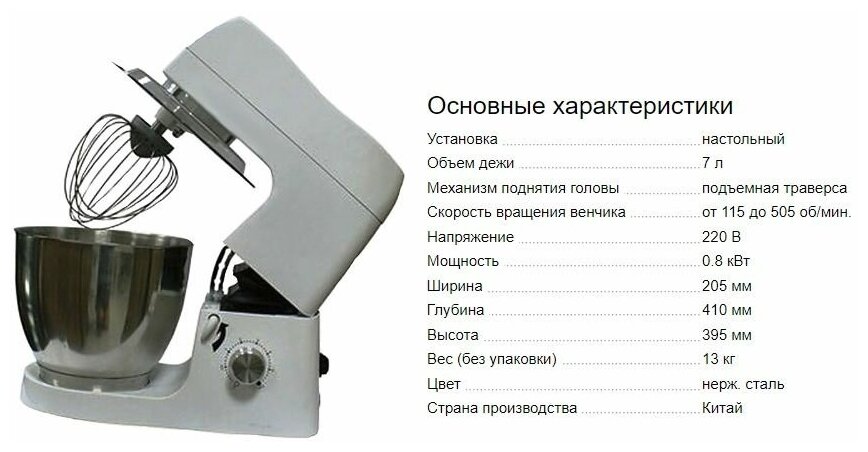 Type: Planetary table mixers, bowl/glass volume: 7 l, power: 800 W, height: 39.50 cm, width: 20.50 cm, depth: 41 cm