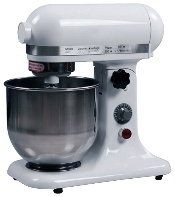 Type: planetary mixer, control type: mechanical, bowl/glass volume: 7 l, maximum rotation speed: 780 rpm, speed variator, maximum load: 1.40 kg, power: 300 W, height: 42.50 cm, width: 41 cm , depth: