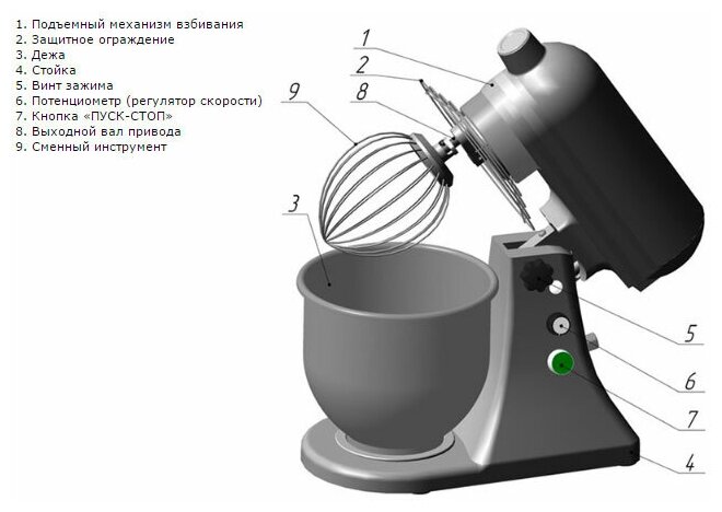 Type: planetary mixer, control type: mechanical, bowl/glass volume: 7 l, maximum rotation speed: 660 rpm, speed variator, power: 510 W, height: 42 cm, width: 24 cm, depth: 42 cm