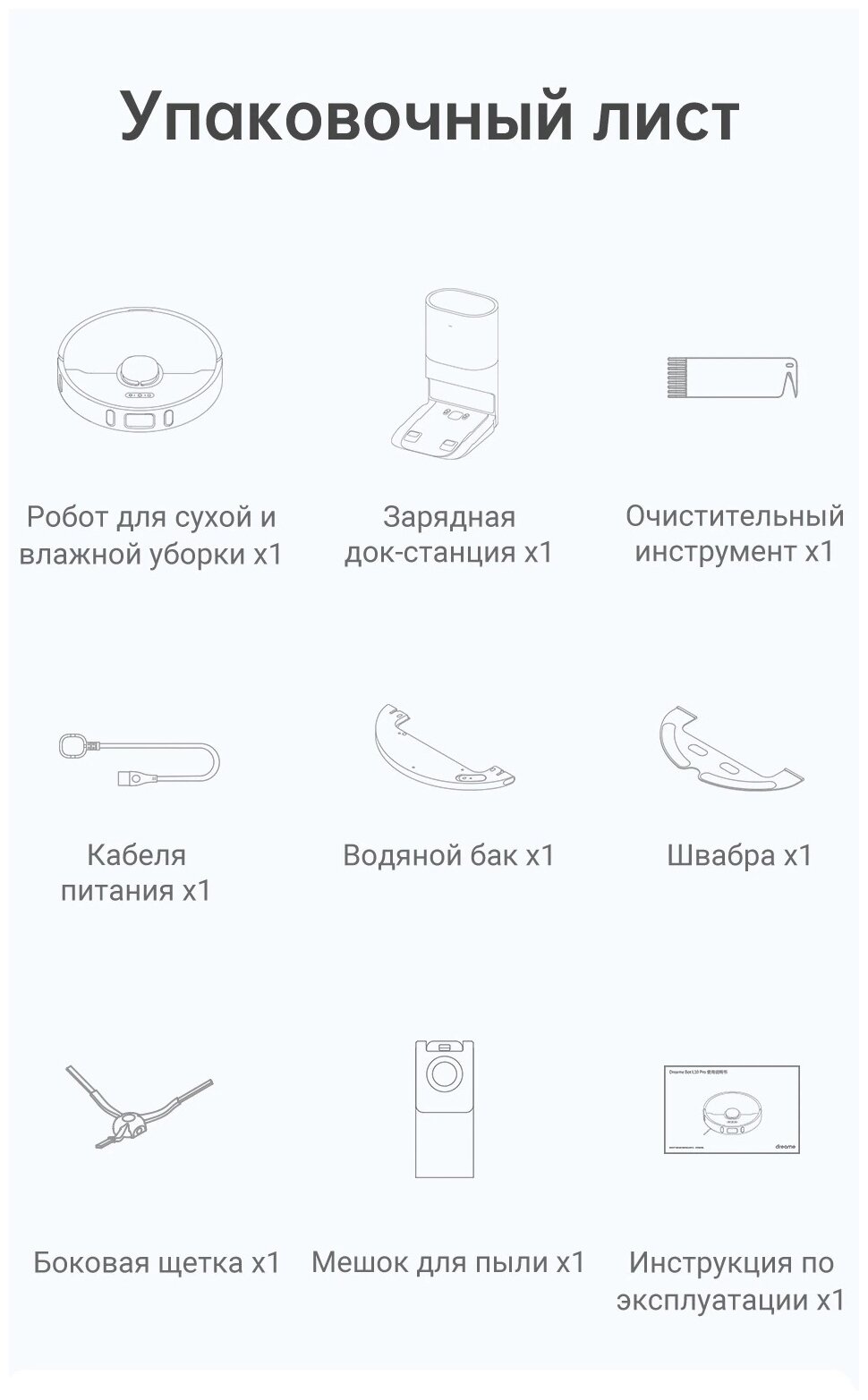 Cleaning area up to 250 sq.m; auto-identification of objects on the floor; obstacle and height sensors;