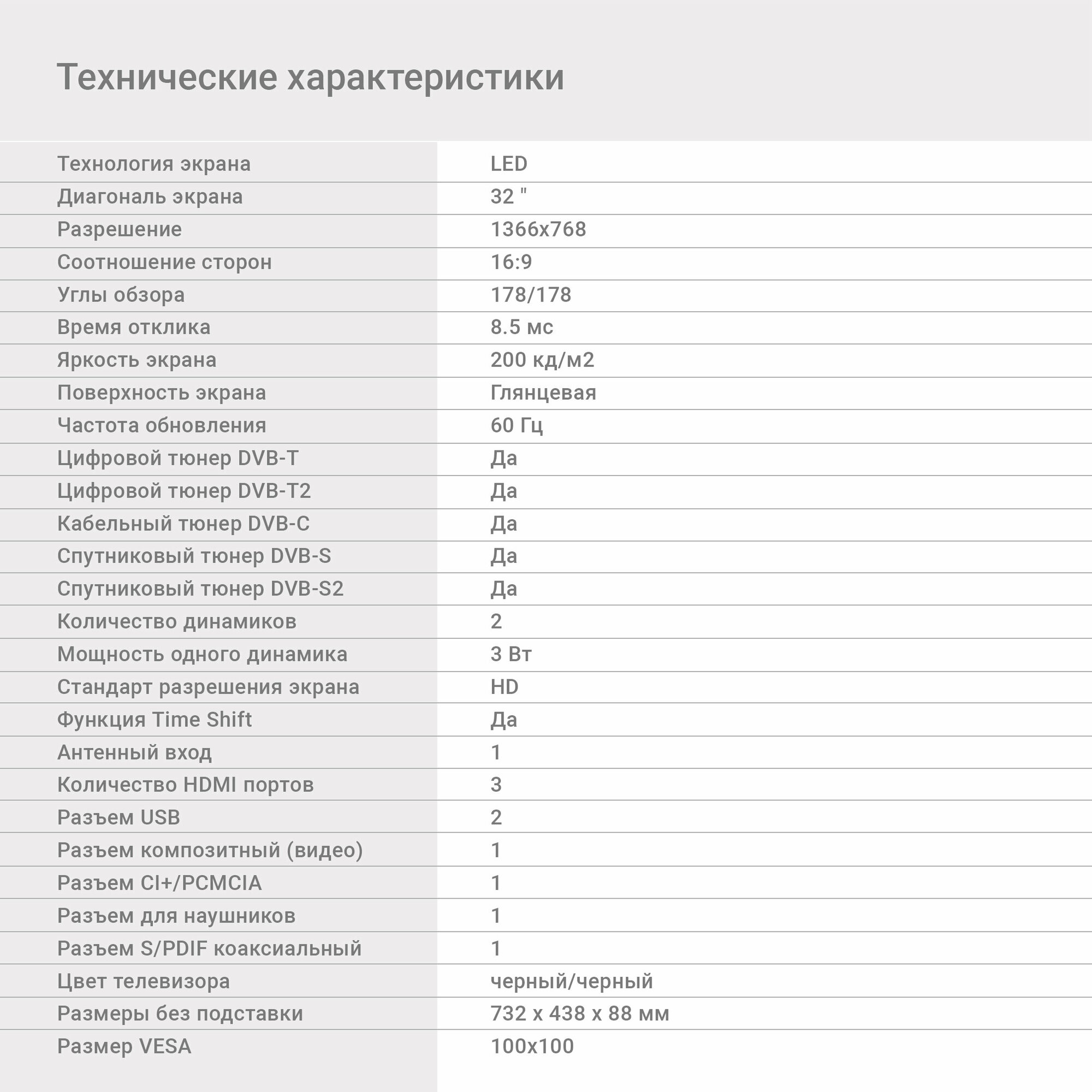 Diagonal: 32"-39", diagonal exactly: 32", HD resolution: 720p HD, screen refresh rate: 60 Hz, screen technology: LED, Digital TV support: no, Smart TV platform: no Smart TV