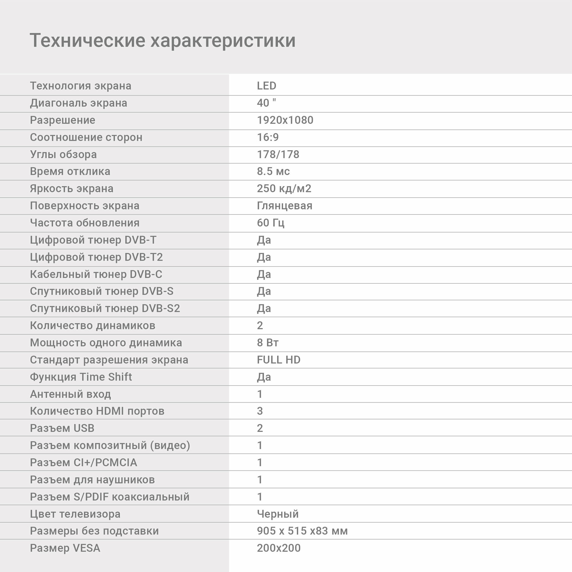 Diagonal: 40-45, diagonal exactly: 40, HD resolution: Full HD, screen refresh rate: 60Hz, screen technology: LED