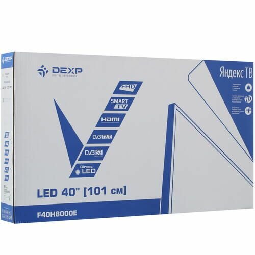 Diagonal: 40"-45", diagonal exactly: 39.76", HD resolution: Full HD, screen refresh rate: 60 Hz, screen technology: LED, Digital TV support: DVB-C, DVB-S2, DVB-T, DVB- T2, no, DVB-C2, Smart TV platform: Yandex TV, wireless communication: Bluetooth, Wi-Fi,