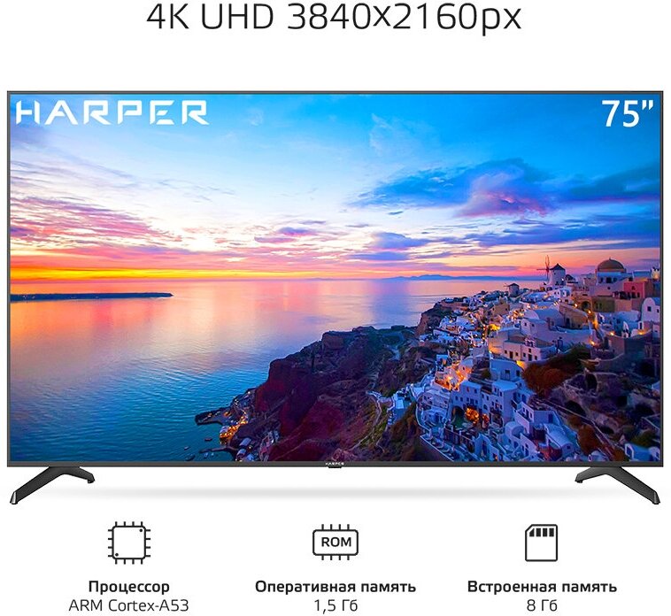 Diagonal: 70"-85", diagonal exactly: 75", HD resolution: 4K UHD, screen refresh rate: 60 Hz, screen technology: HDR, Digital TV support: DVB-C, DVB-T, DVB-T2, analog PAL , SECAM, NTSC, Smart TV platform: Android, wireless communications: Bluetooth, Wi-Fi,