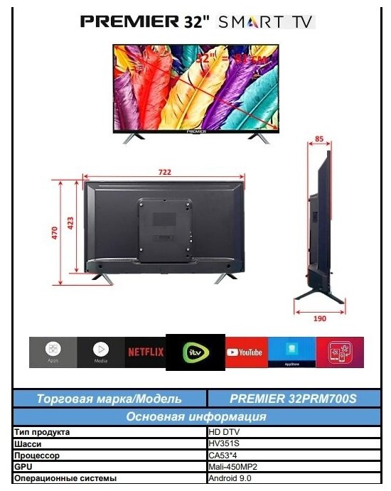 Diagonal: 32"-39", diagonal exactly: 32", HD resolution: 720p HD, screen refresh rate: 60 Hz, screen technology: HDR, LED, Digital TV support: DVB-C, DVB-S, DVB-T, DVB-T2, analog PAL, SECAM, NTSC, Smart TV platform: Android, wireless connection: Wi-F