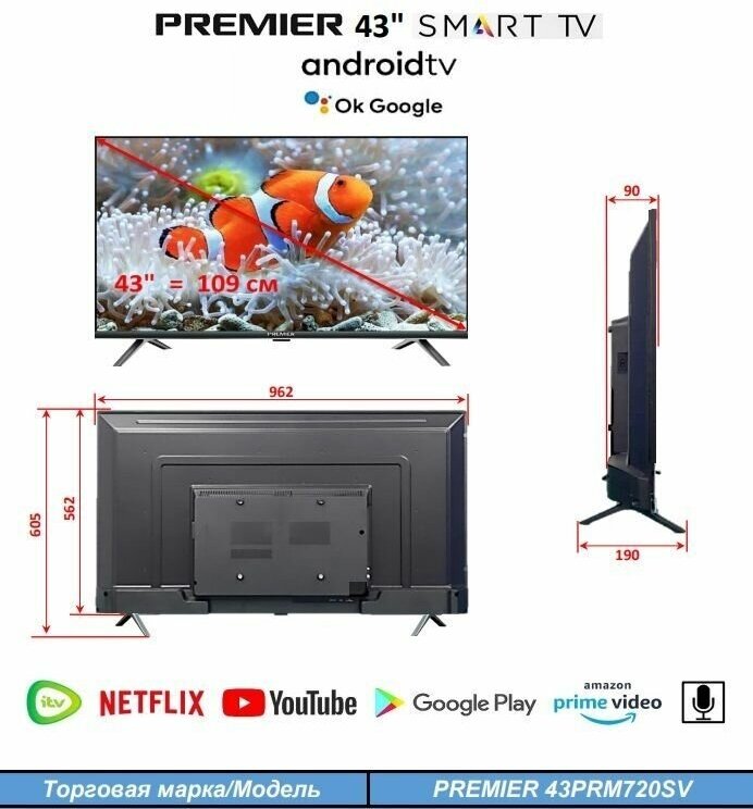 Diagonal: 40"-45", diagonal exactly: 43", HD resolution: Full HD, screen refresh rate: 60 Hz, screen technology: HDR, Digital TV support: DVB-C, DVB-S, DVB-S2, DVB- T, DVB-T2, analog PAL, SECAM, NTSC, Smart TV platform: Android, wireless: B