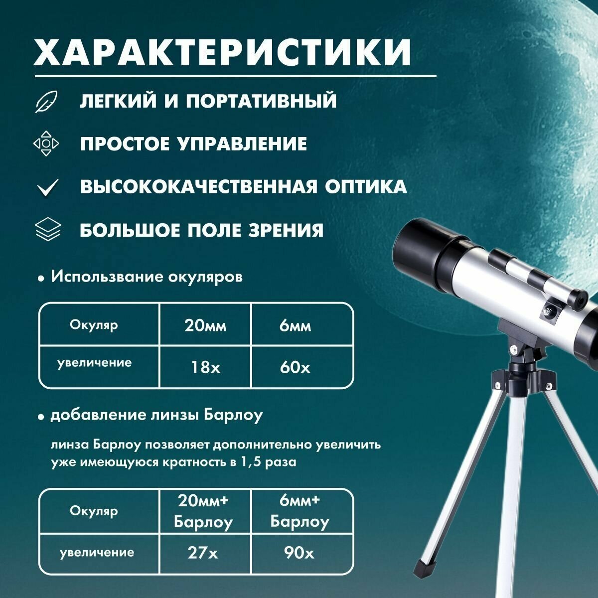 Telescope - 1 piece, eyepieces 6 mm and 20 mm, tripod - 1 piece, constellation map - 1 piece, lunar filter - 1 piece, protective cover - 1 piece, diagonal mirror - 1 piece, viewfinder - 1 piece, BARLOW lens 1.5 x - 1 piece, BARLOW lens 3 x - 1 piece, inst