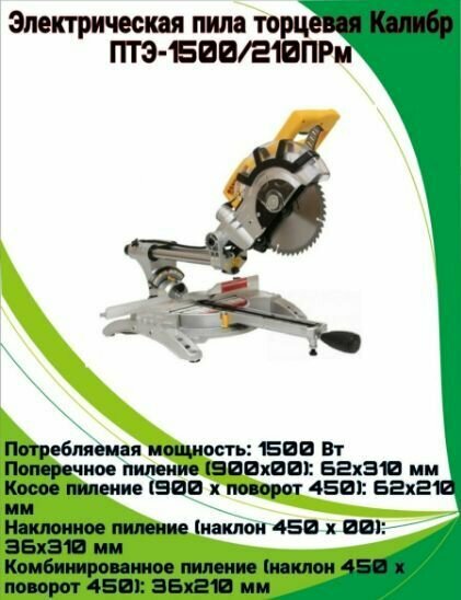 Type: miter saw, laser marker, disc diameter: 216 mm, Power W: 1500, cutting depth 90°: 65 mm, cutting width 90°: 305 mm, with pull, power supply: from the mains, design features: the ability to connect a vacuum cleaner, laser �