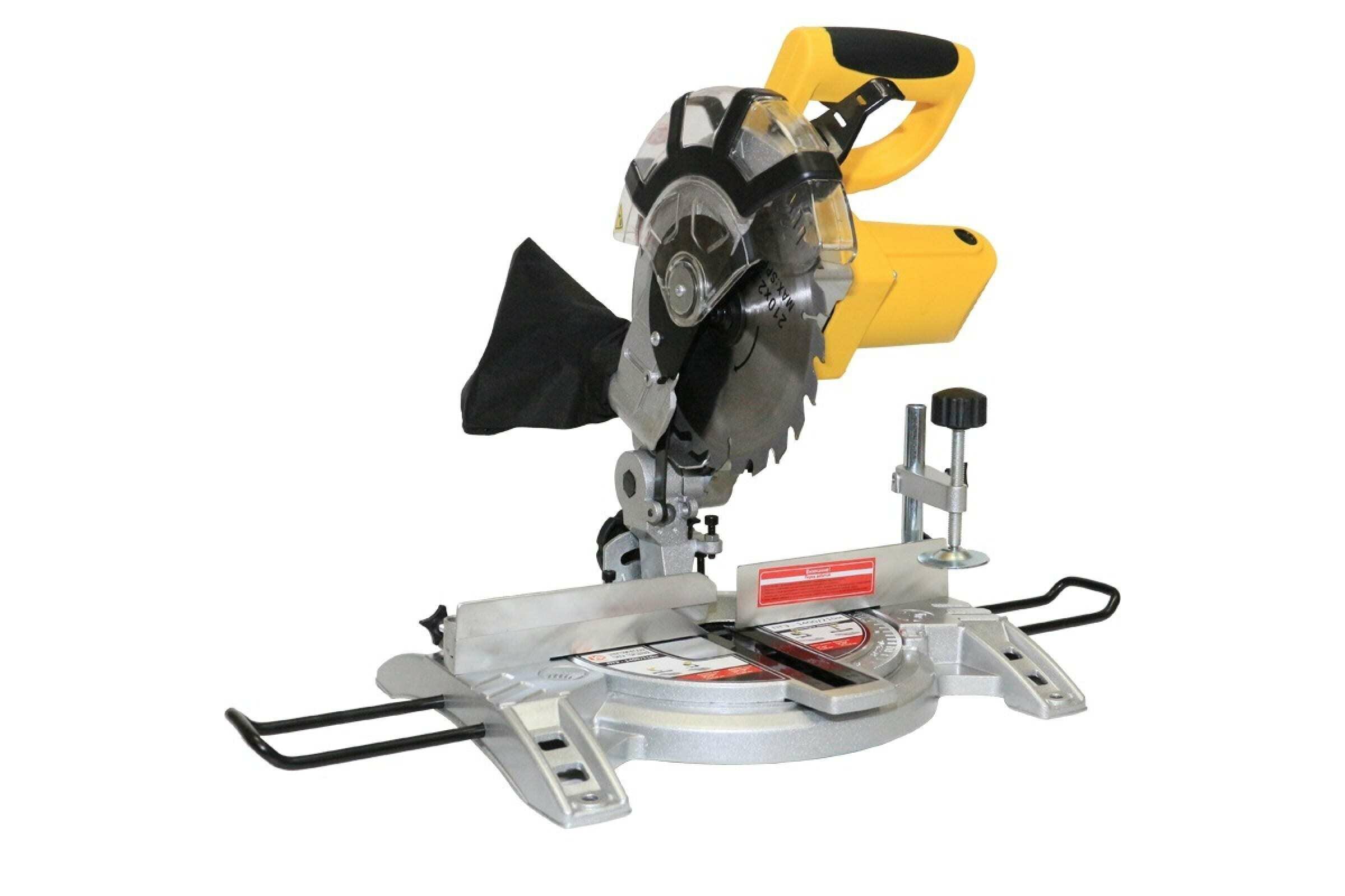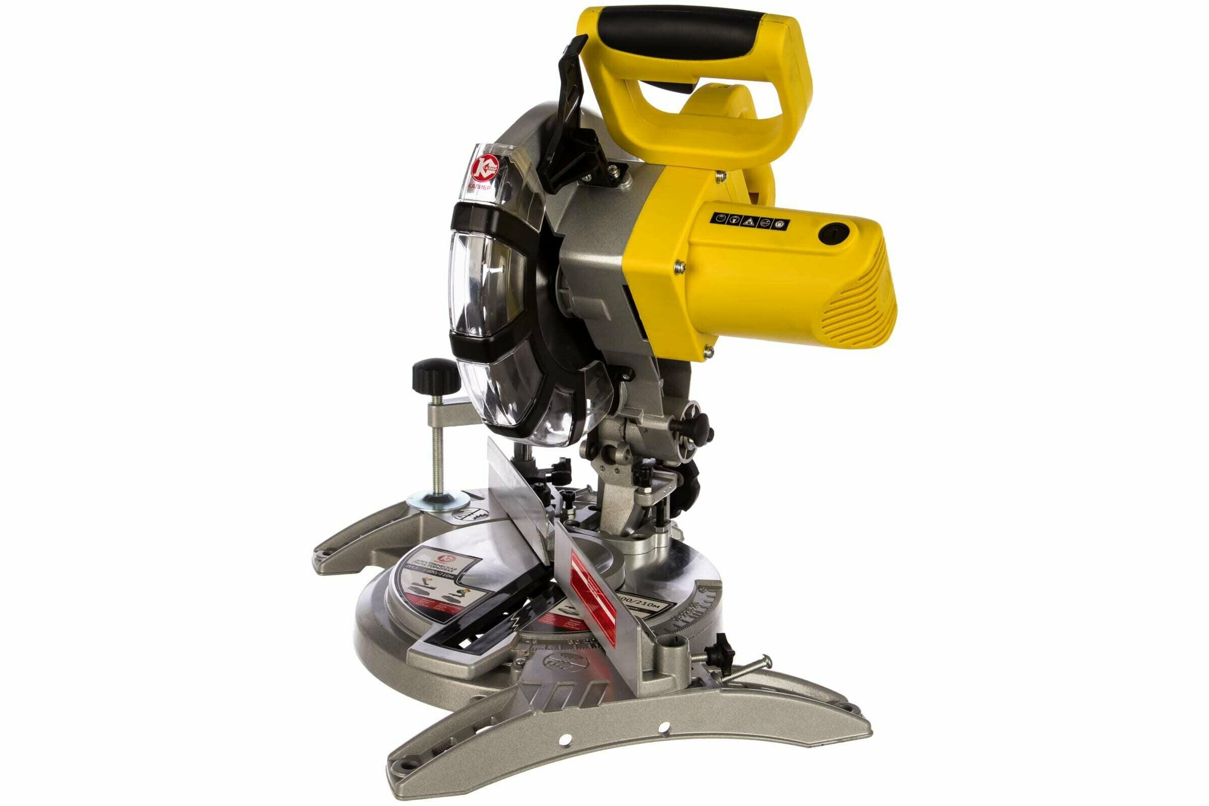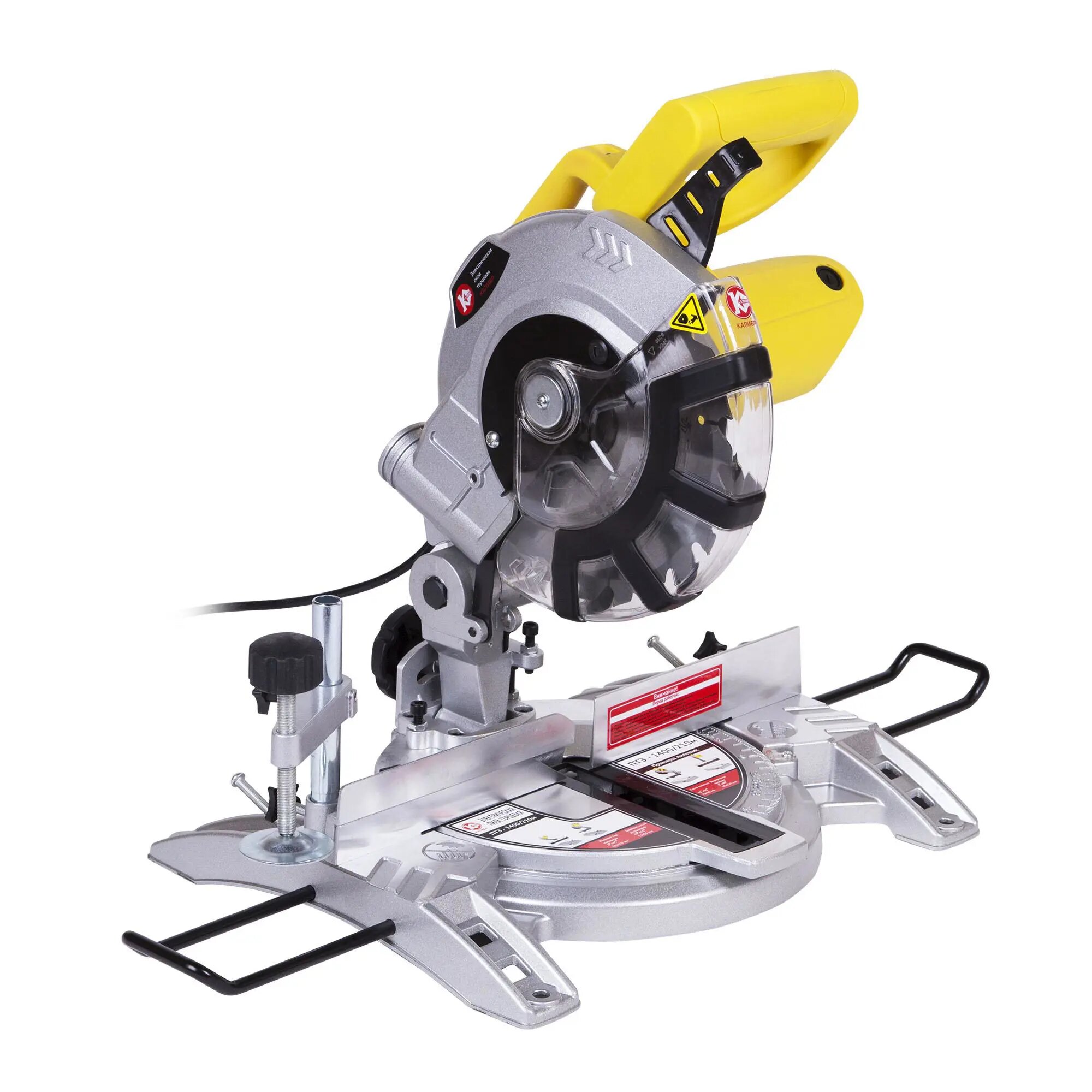 Electric miter saw; Wood saw blade; Vertical clamp clamp; Disc mounting key; 2 graphite brushes; Dust collector; 2 additional supports; Manual; Package.