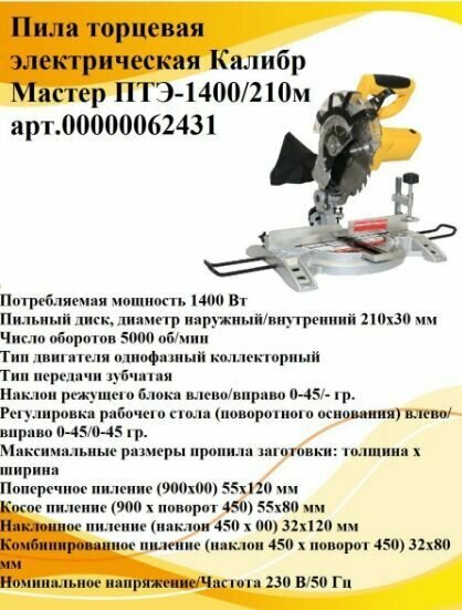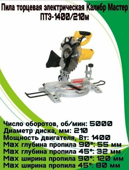 Type: miter saw, laser marker, disc diameter: 216 mm, Power W: 1500, cutting depth 90°: 65 mm, cutting width 90°: 305 mm, with pull, power supply: from the mains, design features: the ability to connect a vacuum cleaner, laser �