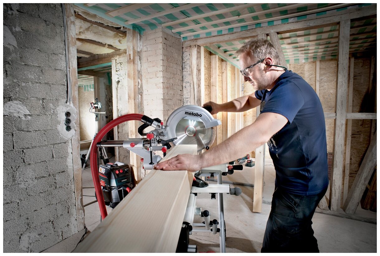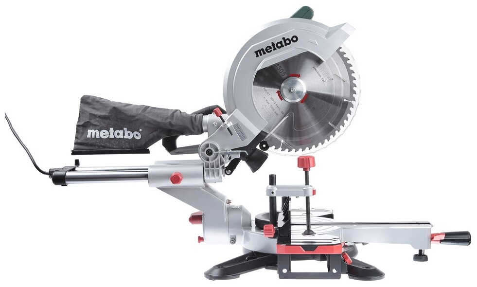 Contents of delivery: Saw blade, 2 built-in table extensions, trim stop, material clamp, saw blade change tool, cable winder, dust collector