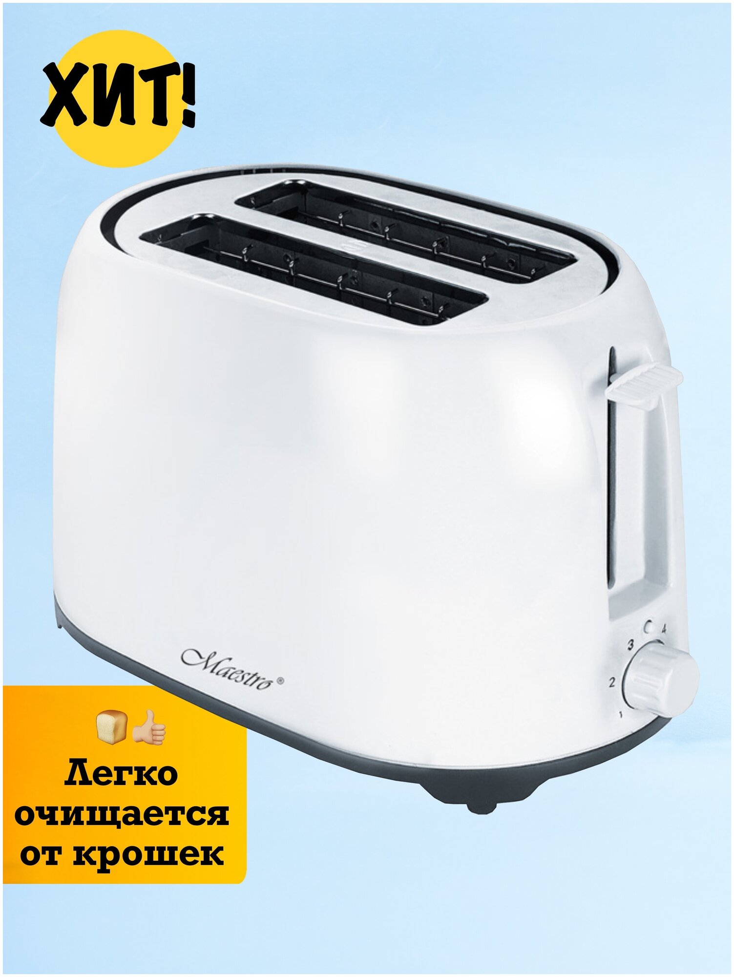 Number of toasts: 2, number of compartments: 2, included: crumb tray, body material: metal, plastic, additional modes: one-sided frying, power: 800 W, features: sound notification, compartment