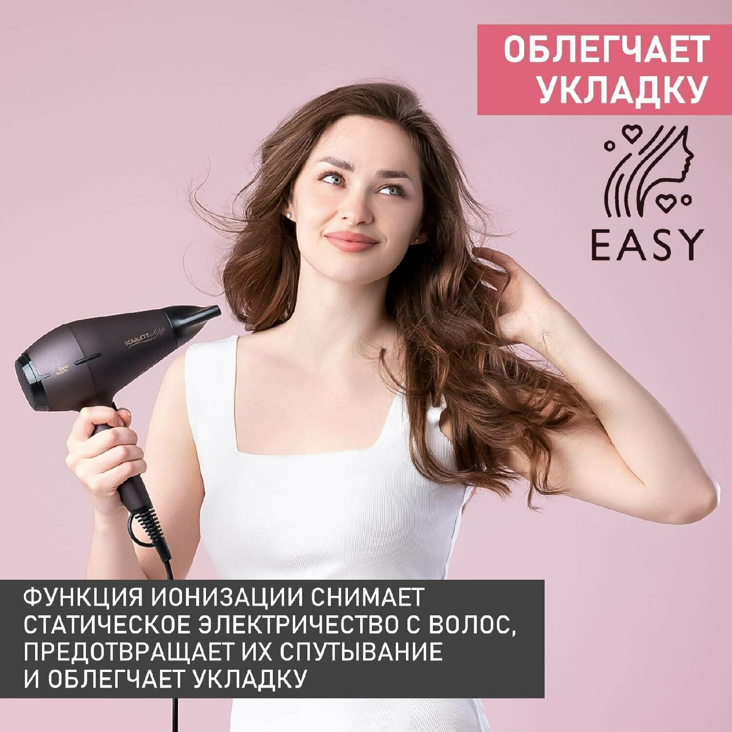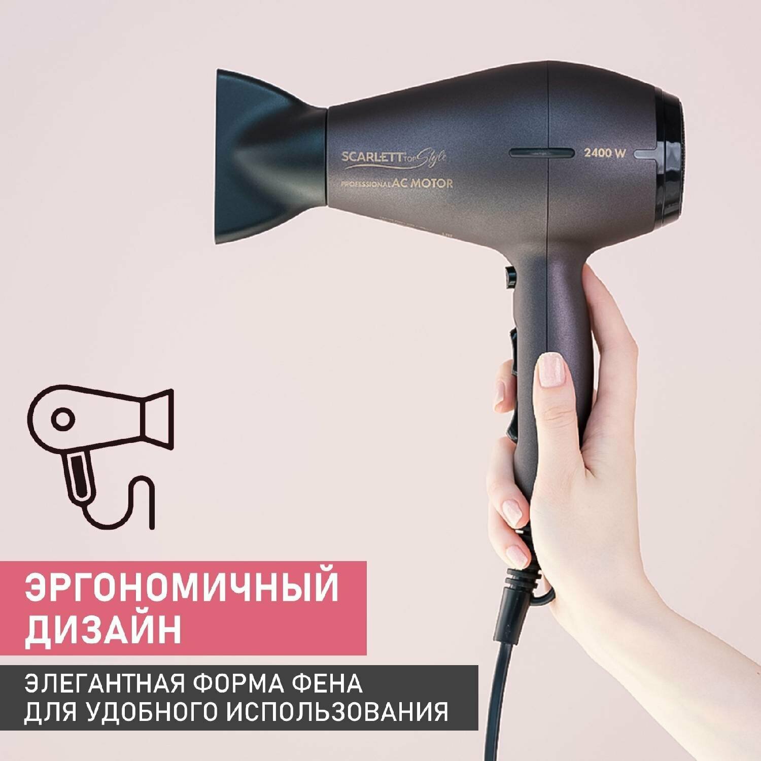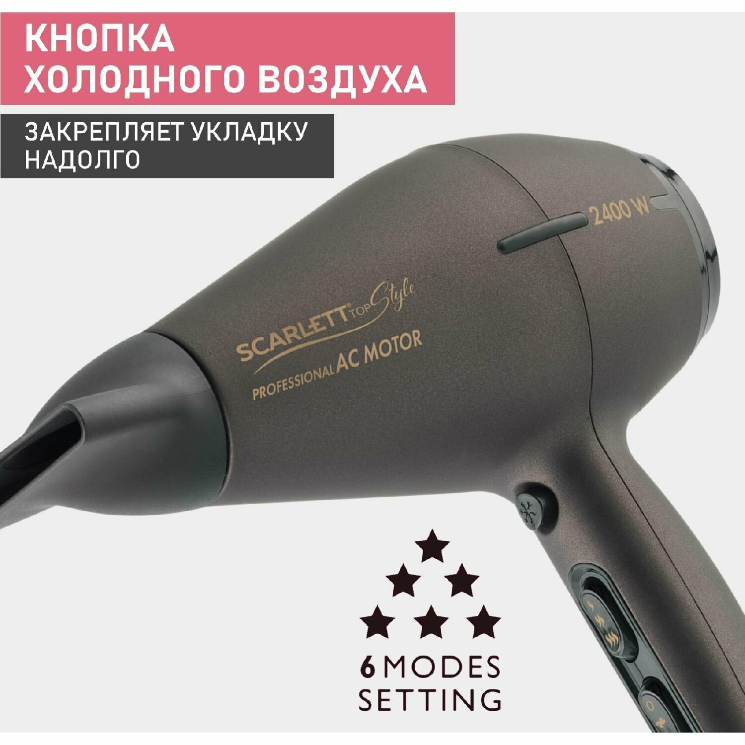 Type: hair dryer, hair dryer power: 2400 W, additional functions: ionization, cold air supply, ionization, cold air supply, nozzles: concentrator, number of heating modes: 3, number of speeds: 2, features: