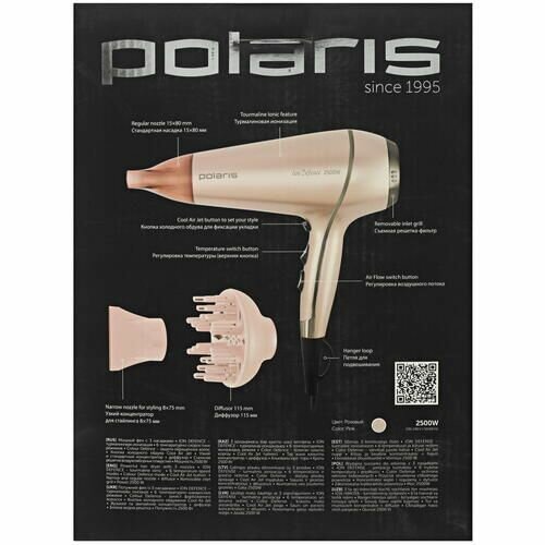 Type: hair dryer, accessory type: concentrator, additional functions: cold air supply, number of speeds: 2, power cord length: 1.75 m, weight: 540 g