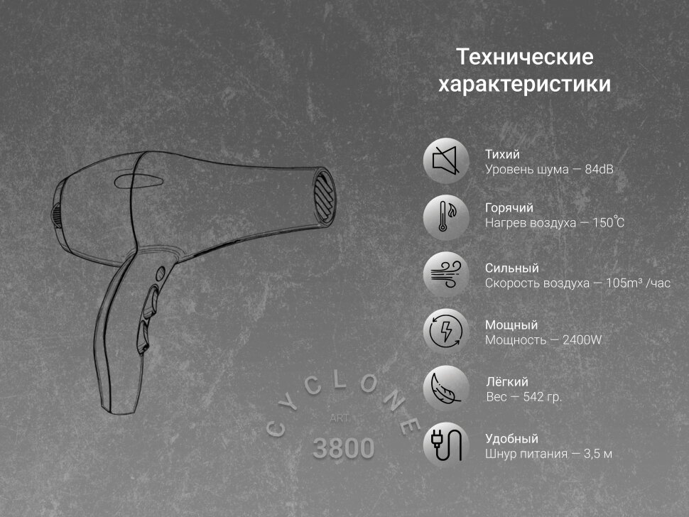Type: hair dryer, hair dryer power: 2400 W, attachments: concentrator, power cord length: 3.50 m, weight: 542 g