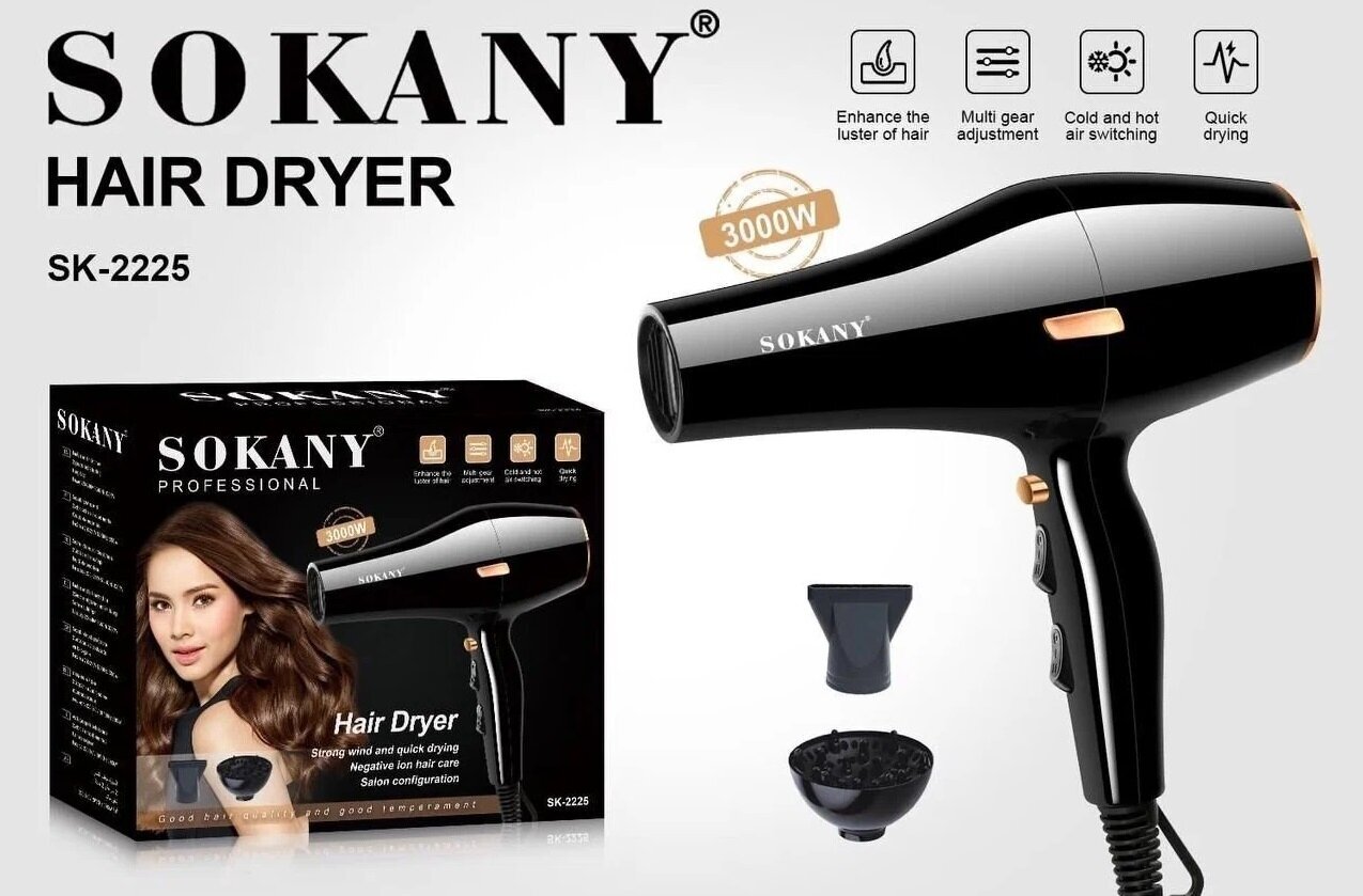 Type: hair dryer, hair dryer power: 3000 W, additional functions: ionization, cold air supply, nozzles: diffuser, concentrator, number of speeds: 2, travel, power cord length: 2 m, weight: 800 g