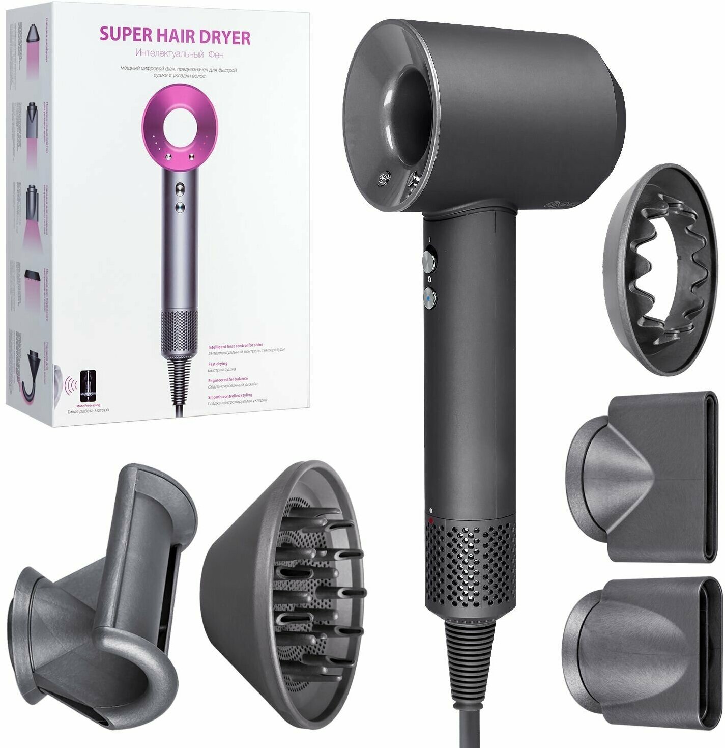 Type: hair dryer, accessory type: conical nozzle, additional functions: ionization, cold air supply