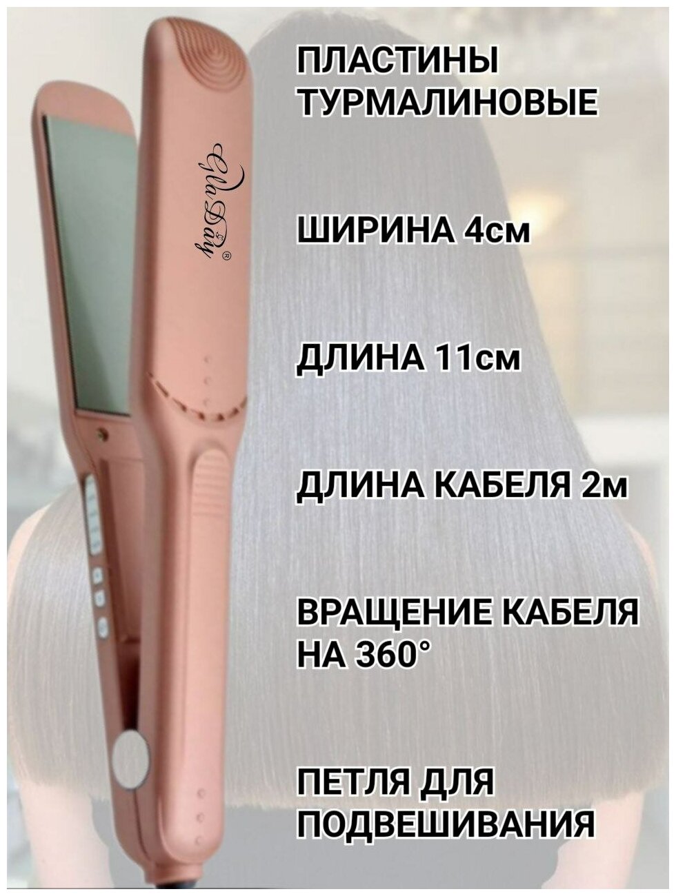 Type: straightener, coating: tourmaline, type of curling iron: for hair straightening, purpose: straightening, curling, styling, plate width: 40 mm, maximum heating temperature: 230 °C, number of heating modes: 5, power: