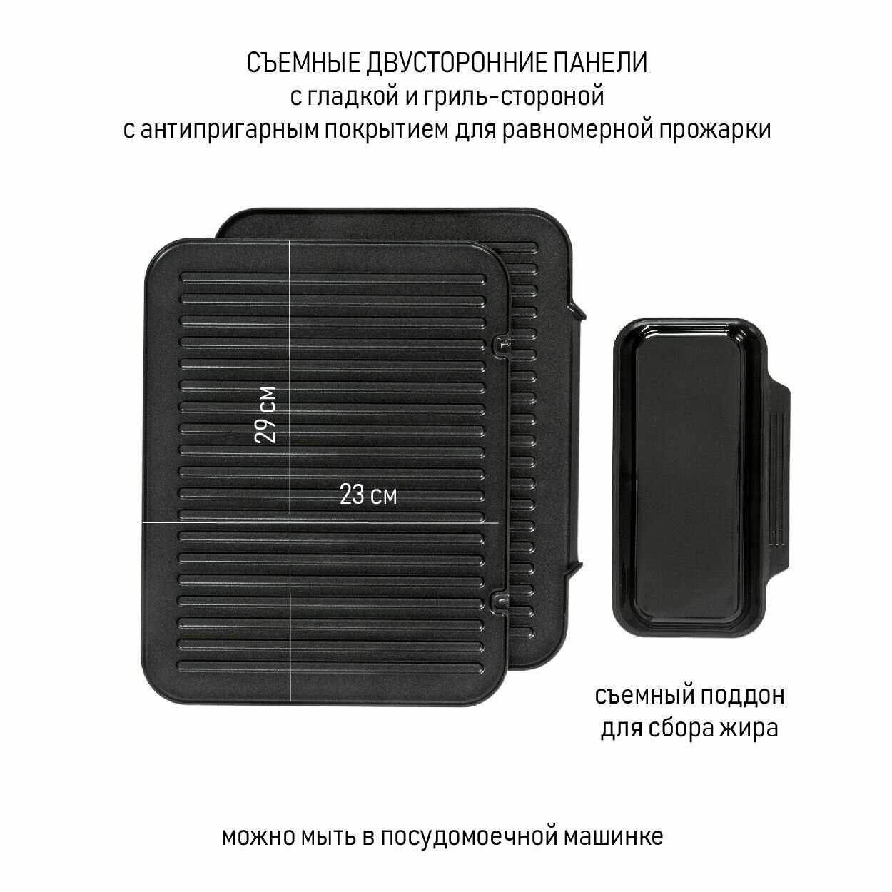 Non-stick coating, fat collection tray, removable plates, Vertical storage, Carrying handle, Replaceable cooking panels