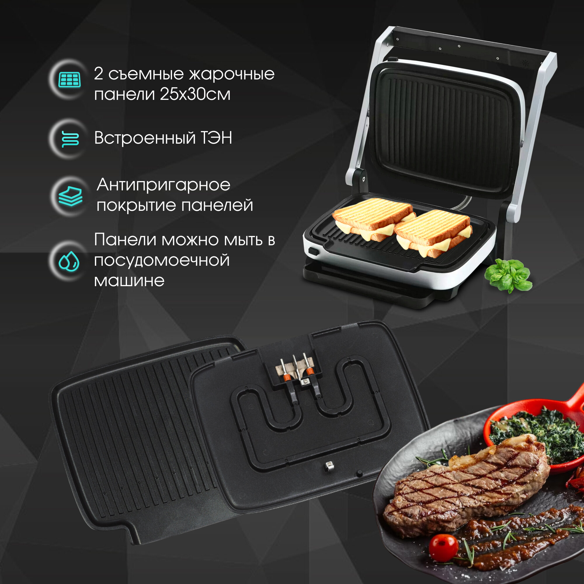 Type: grill, power: 2000 W, control: mechanical, features: non-stick coating, contact grill, fat collection tray, height adjustment of the top panel, removable plates, additional functions: possible