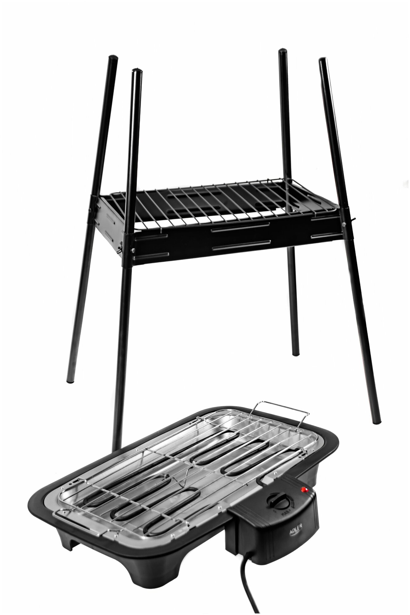 Grill+barbecue, grill; Tray for collecting fat; Removable heating element, temperature adjustment, thermostat indicator, fat tray, stand