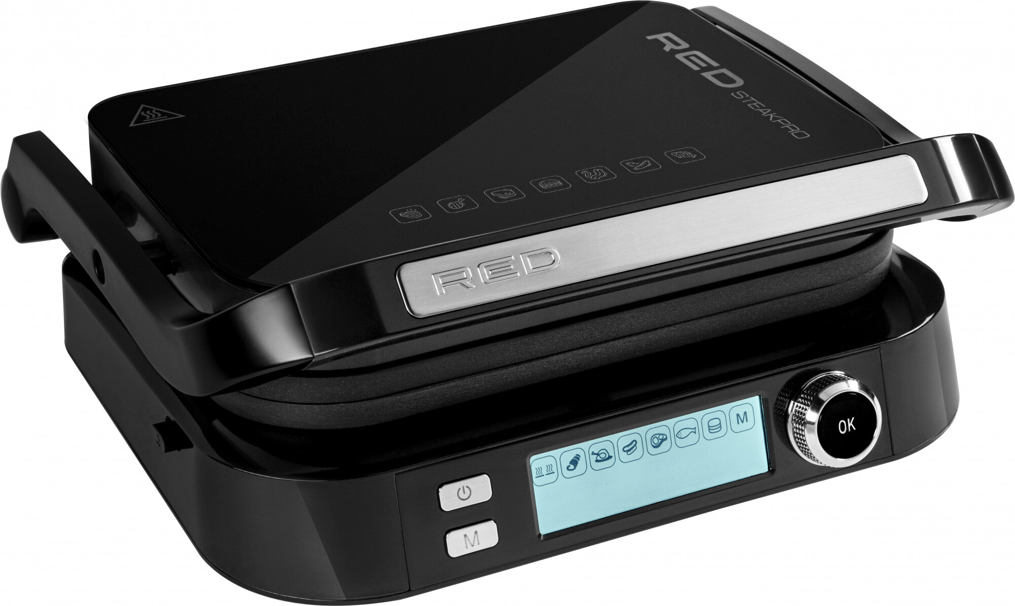 Non-stick coating, contact grill, fat collection tray, adjustable top panel height, removable plates, automatic shut-off