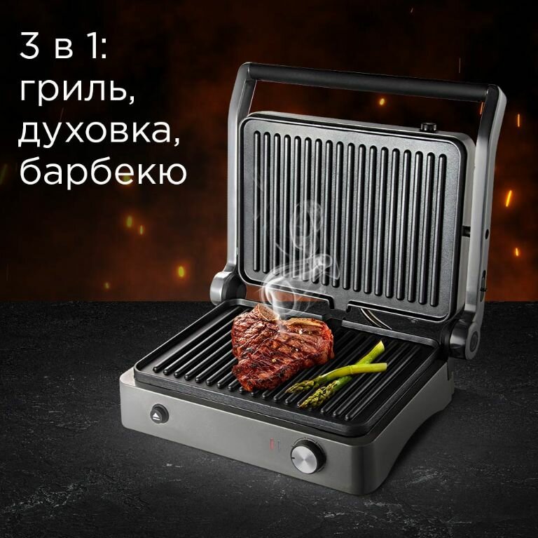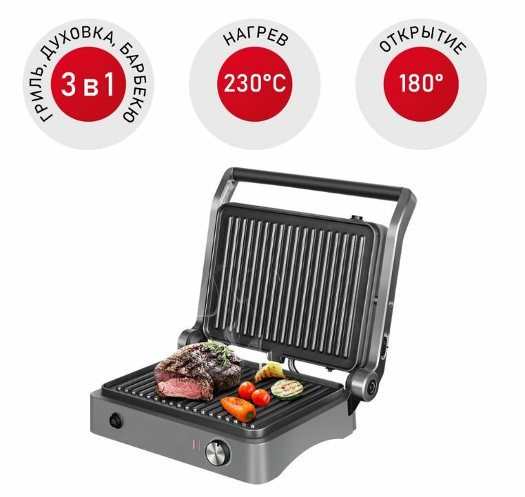 Type: grill, power: 1950 W, control: mechanical, features: non-stick coating, fat collection tray, 180° opening, additional functions: the ability to use the top panel as an independent one,