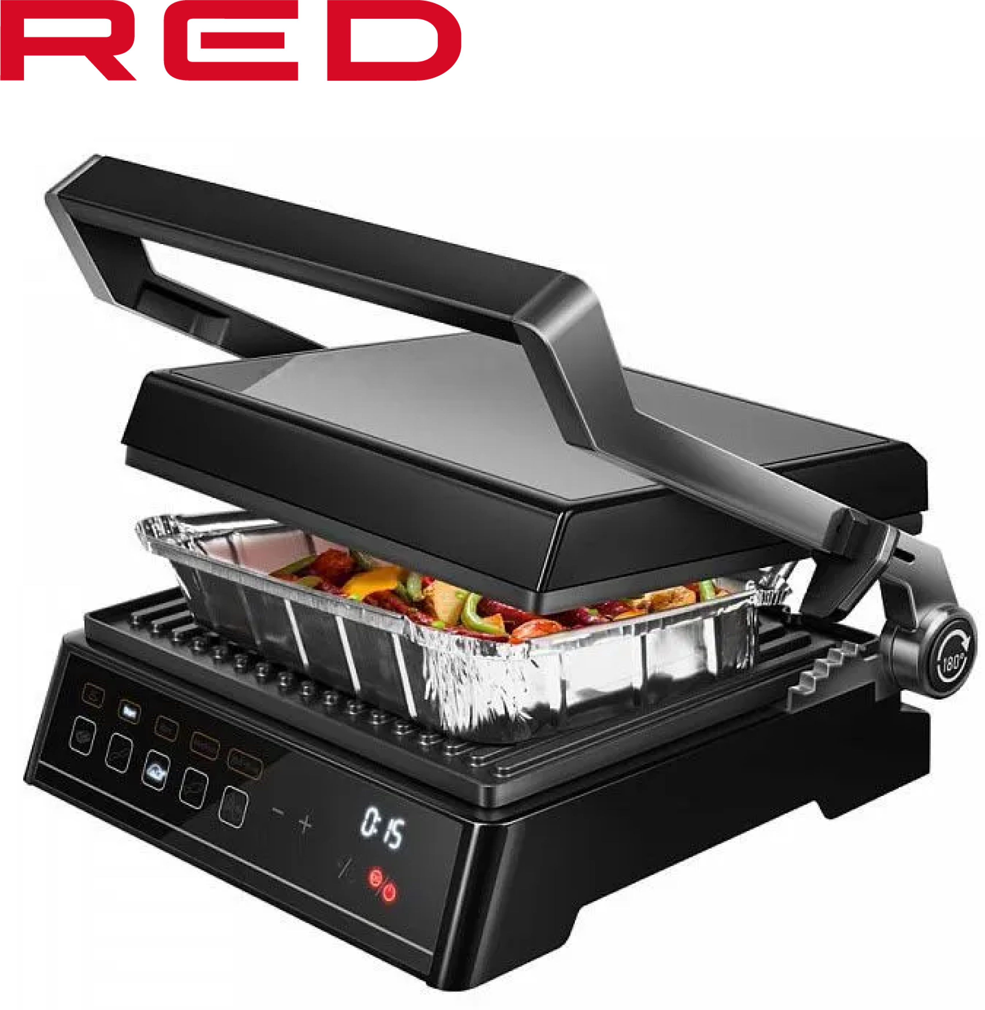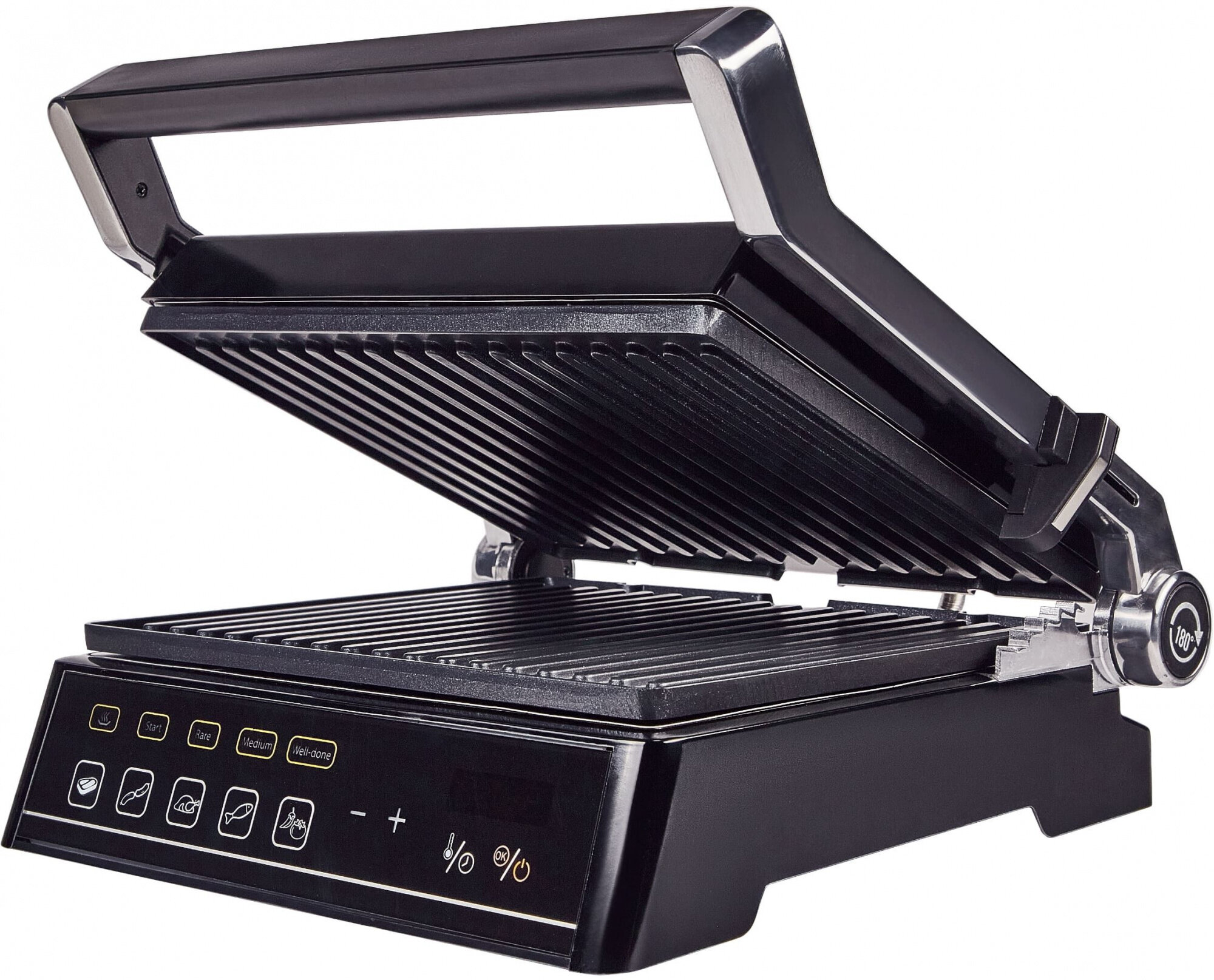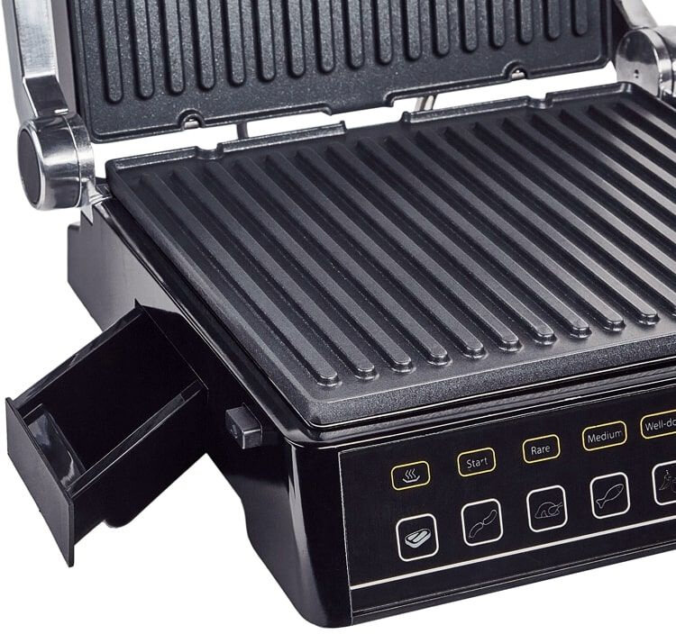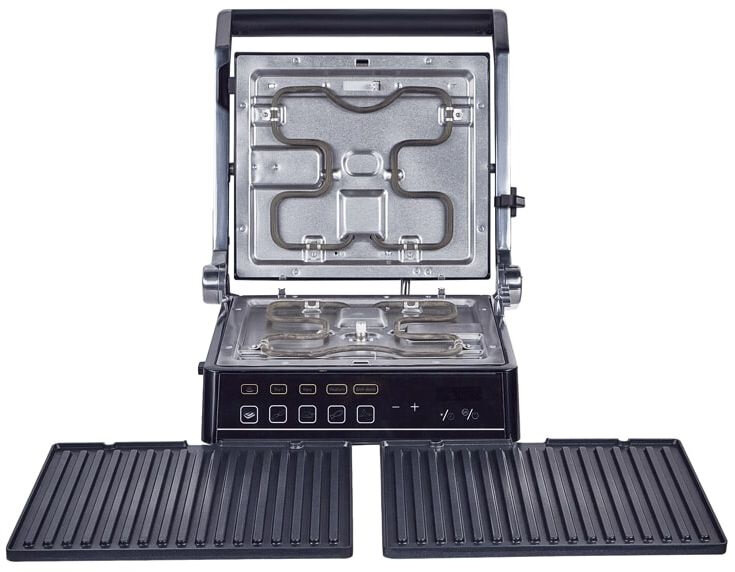 Non-stick coating, contact grill, drip tray, height adjustment of the top panel, removable plates