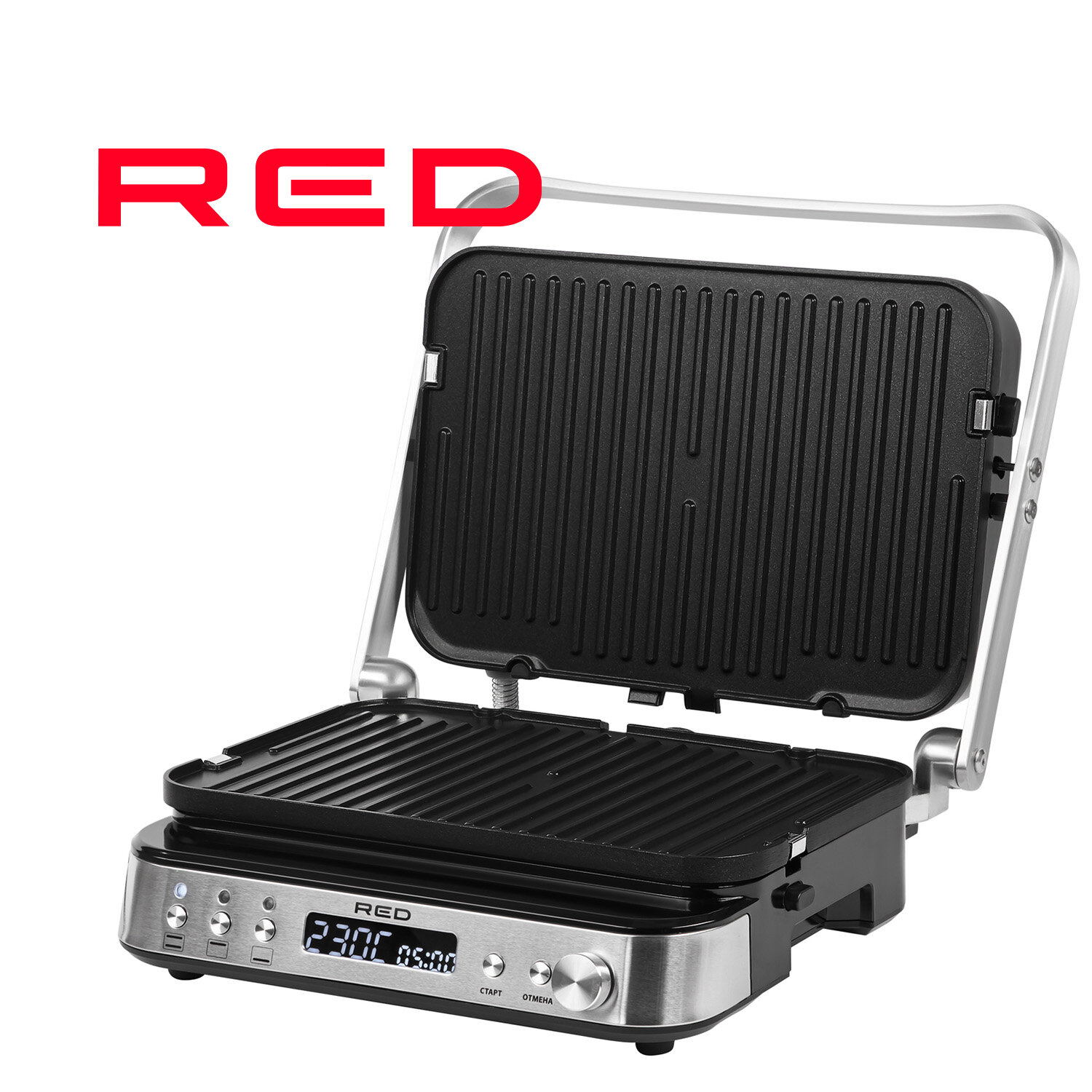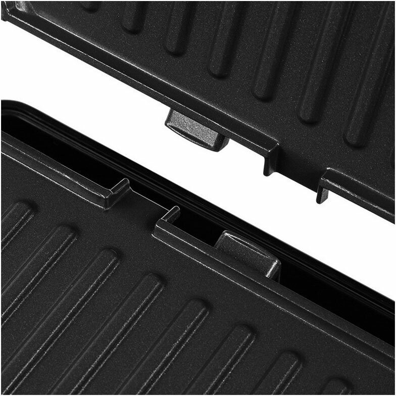 Non-stick coating, fat collection tray, Cord storage compartment, 180° opening, Replaceable cooking panels