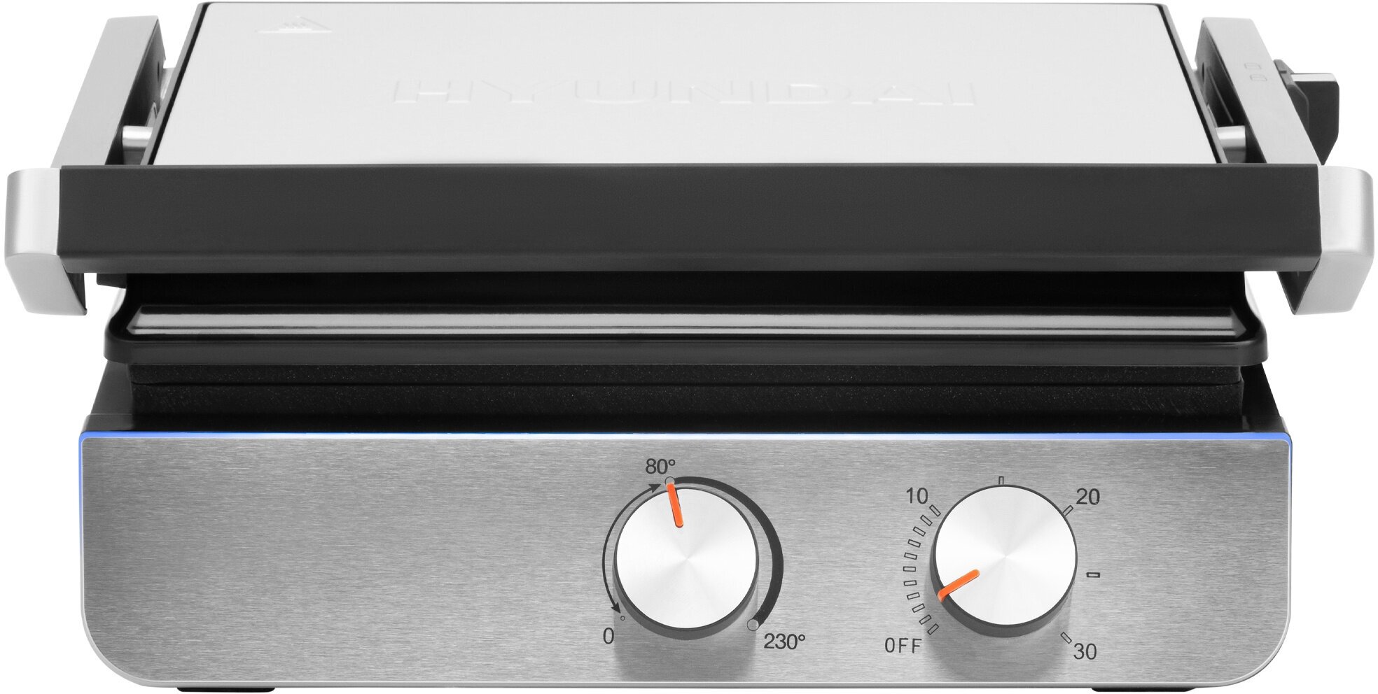 Non-stick coating, lid, fat collection tray, removable plates, 180° opening, locking when closed