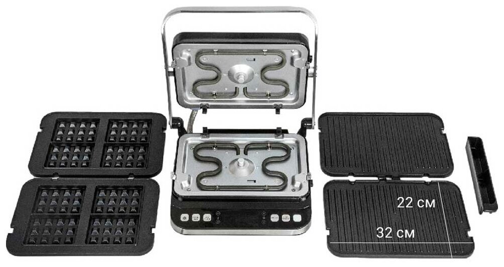 Top heating 1000 W; bottom heating 1000 W; manual mode; panel size: 32 x 22 cm; cord length 100 cm; defrost function