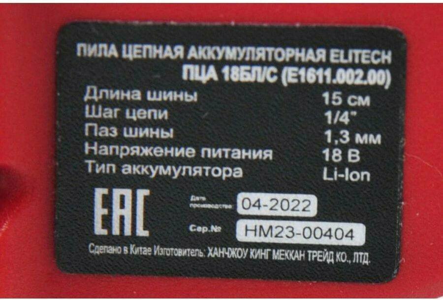 Garden chain saw Elitech PCA 18BL/S without battery and charger