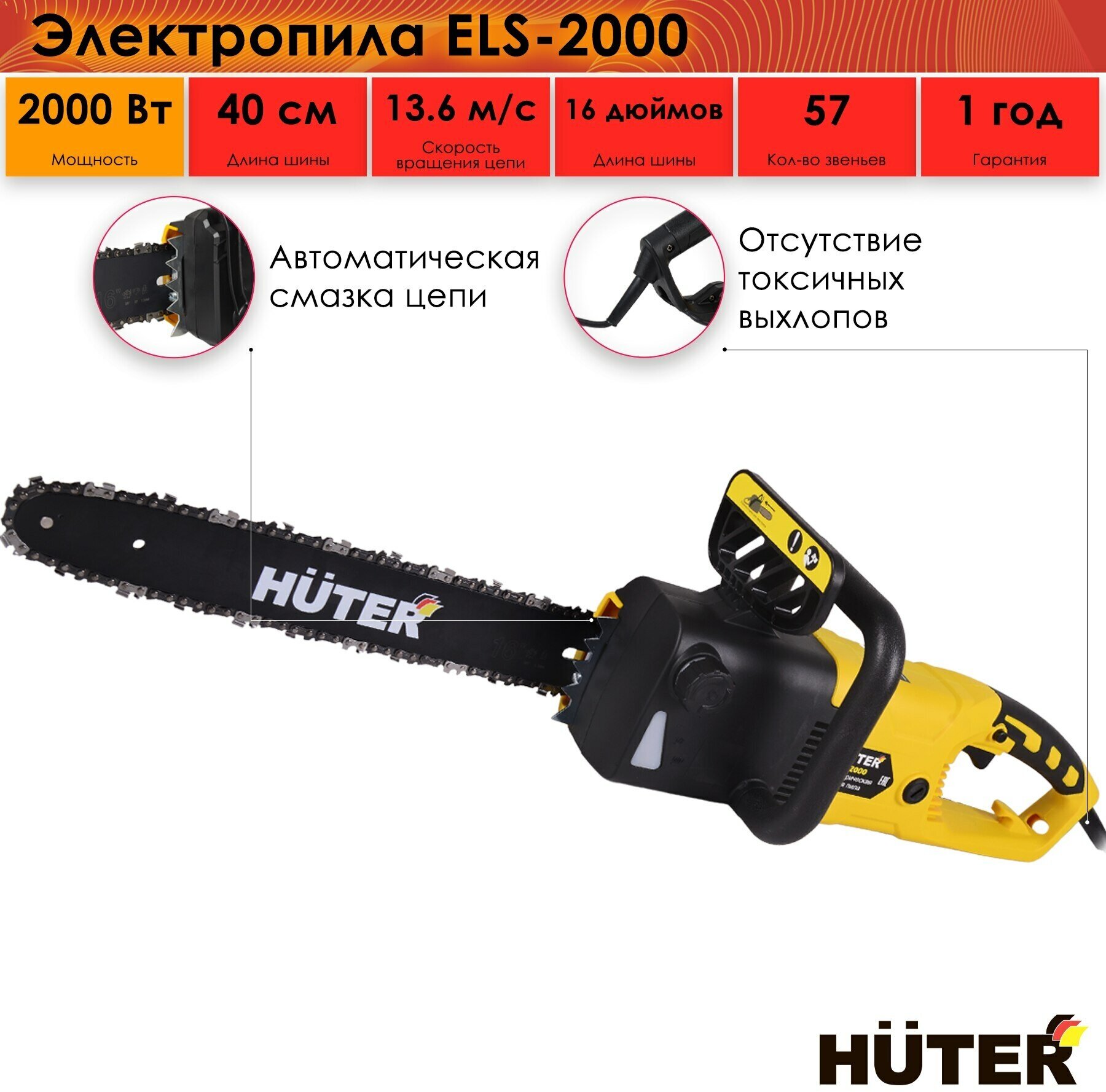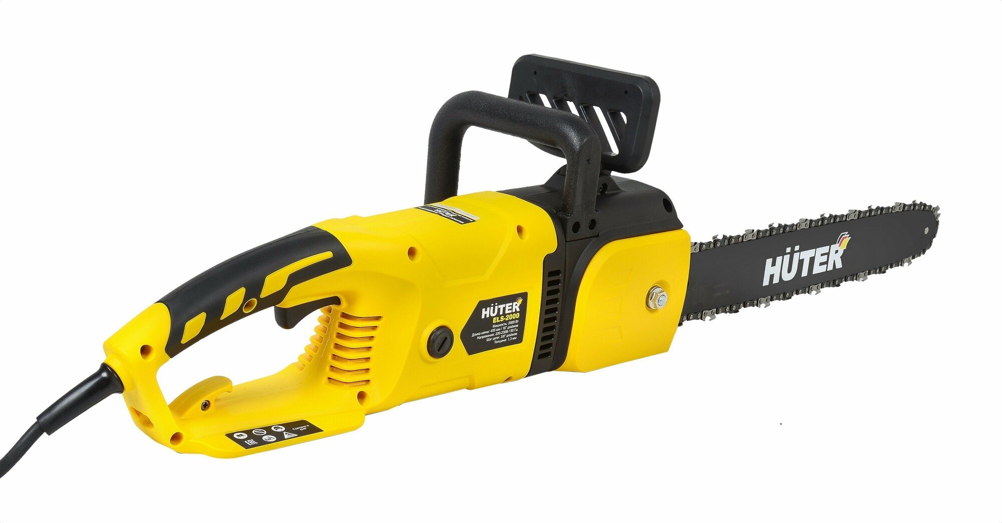 Power type: mains, bus length: 40 cm, power W: 2000 W, hp power: 2.70 hp, weight: 5.90 kg, chain pitch: 3/8 inch, functions: soft start, motor brake , chain brake