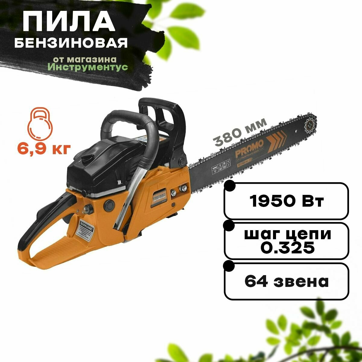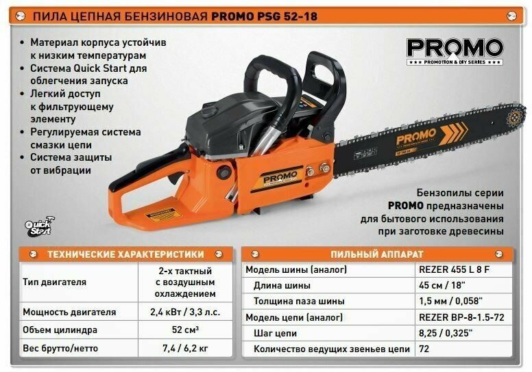 Power type: gasoline, tire length: 45 cm, power W: 1900 W, HP: 2.60 HP, engine capacity: 52 cm³, weight: 6.20 kg, chain pitch: 0.325 inches, functions: chain brake , design features: anti-vibration system