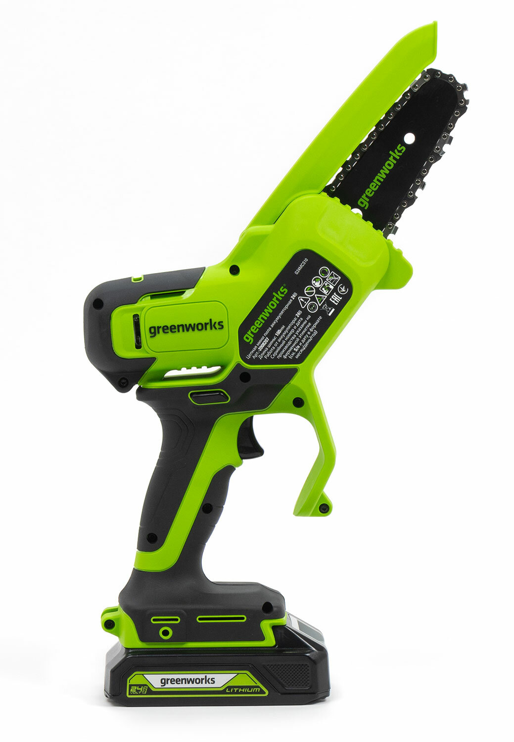 Mini-chain / cordless lopper Greenworks G24MCS10 24V, tire length 10 cm, battery kit 2 Ah + charger