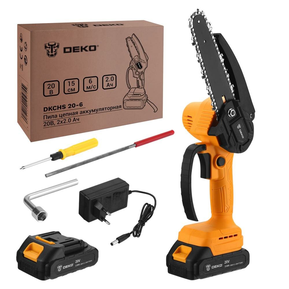 Battery 2 pcs., wrench 1 pc., charger 1 pc., file for sharpening chain 1 pc., screwdriver 1 pc., saw bar and chain included 1 pc.