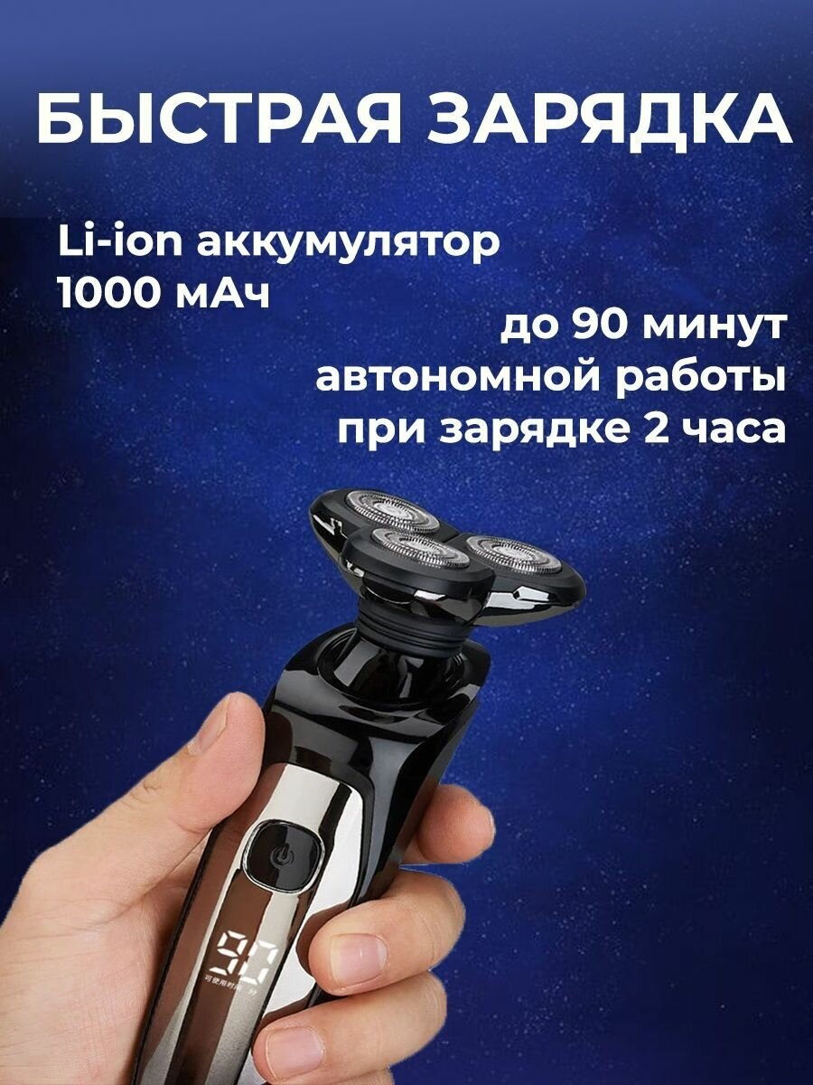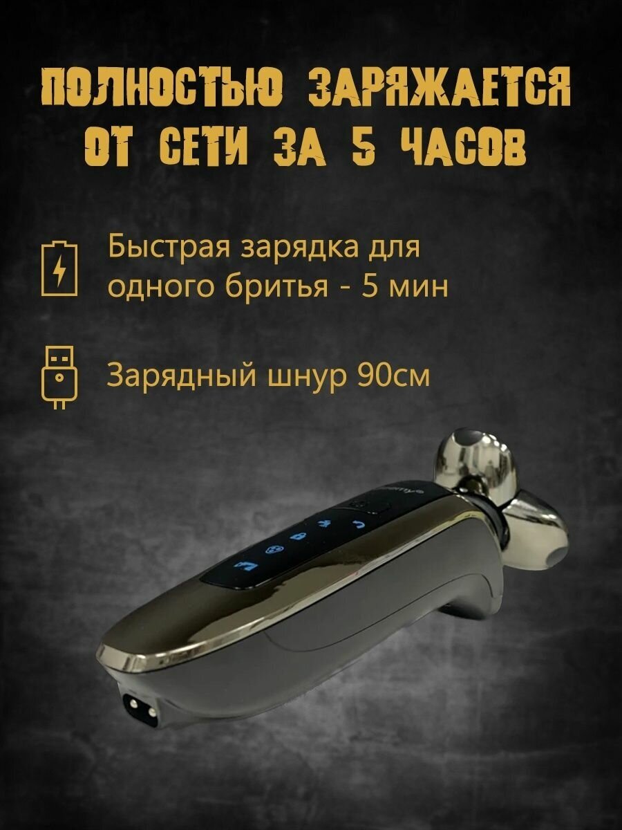 Razor type: rotary, shaving method: dry, power supply: autonomous, features: non-slip insert on the handle, trimmer, number of shaving elements: 3, battery type: NiMH, set includes: protective cover, cleansing brush