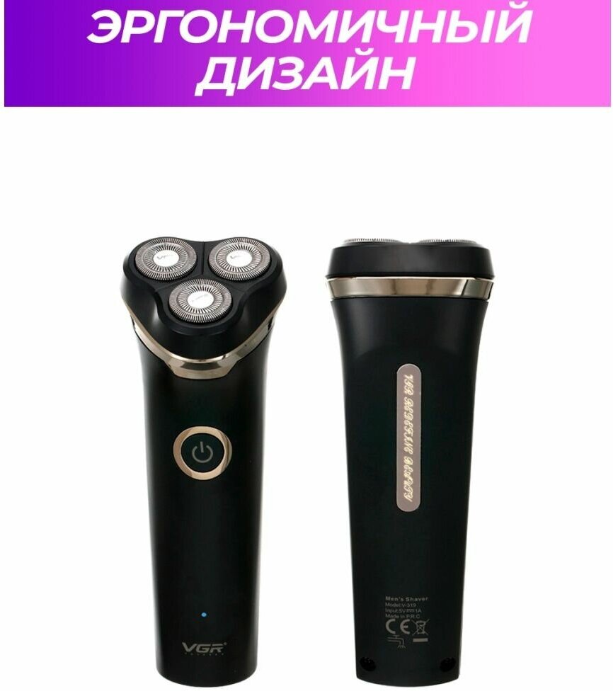 Razor type: rotary, shaving method: dry, power supply: autonomous, features: non-slip insert on the handle, trimmer, number of shaving elements: 3, battery type: NiMH, set includes: protective cover, cleansing brush