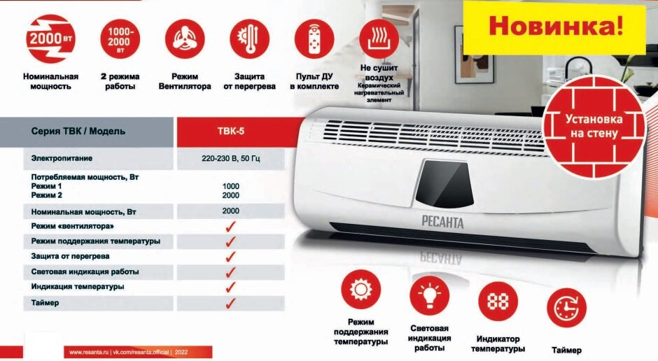 Heater type: fan heater, installation: wall-mounted, heating element type: ceramic, features: display, remote control, temperature adjustment, timer, thermostat, protection systems: shutdown when overheating