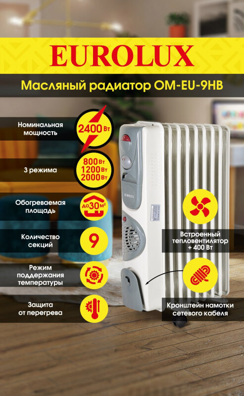 Heater type: oil radiator, installation: floor-standing, heating element type: heating element, features: thermostat, Wheels, compartment for the power cord, protection systems: shutdown when overheating, control: mechanical