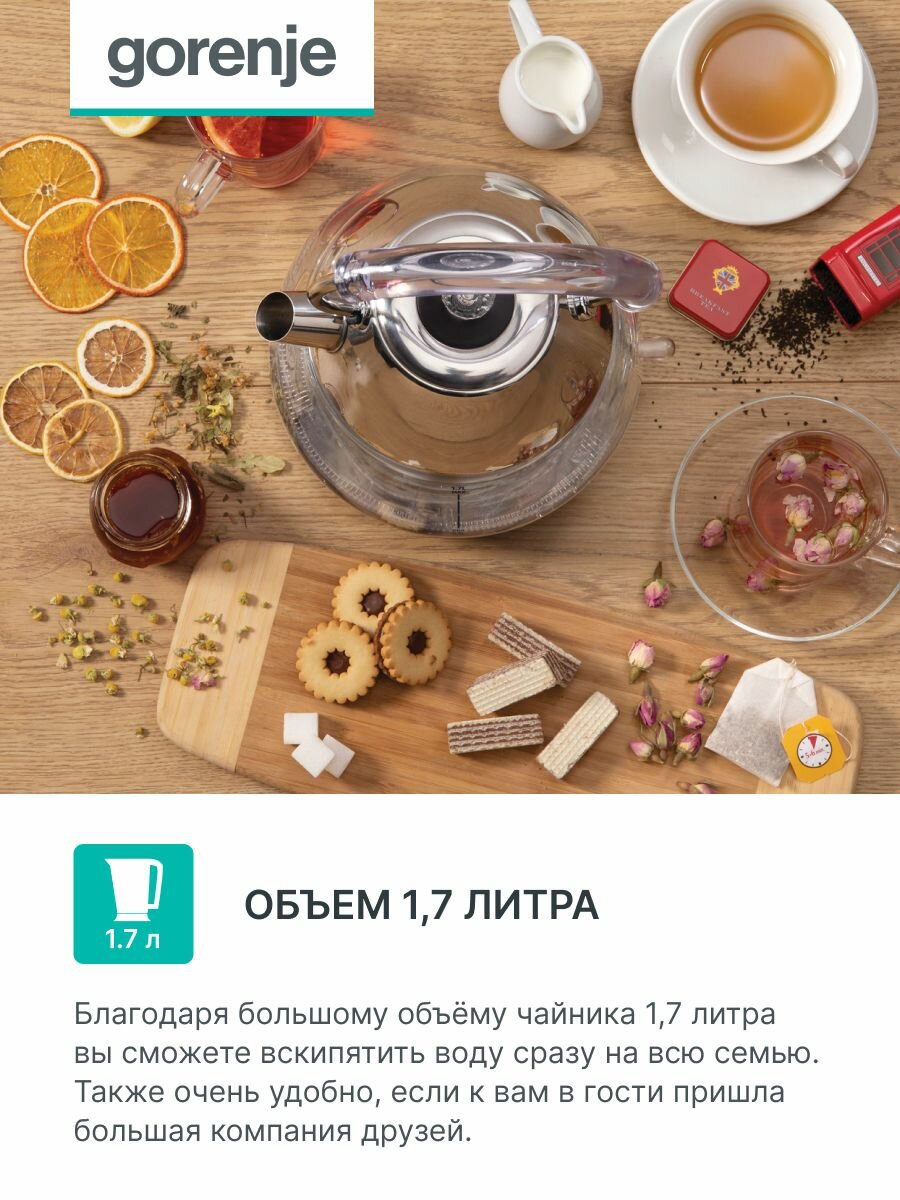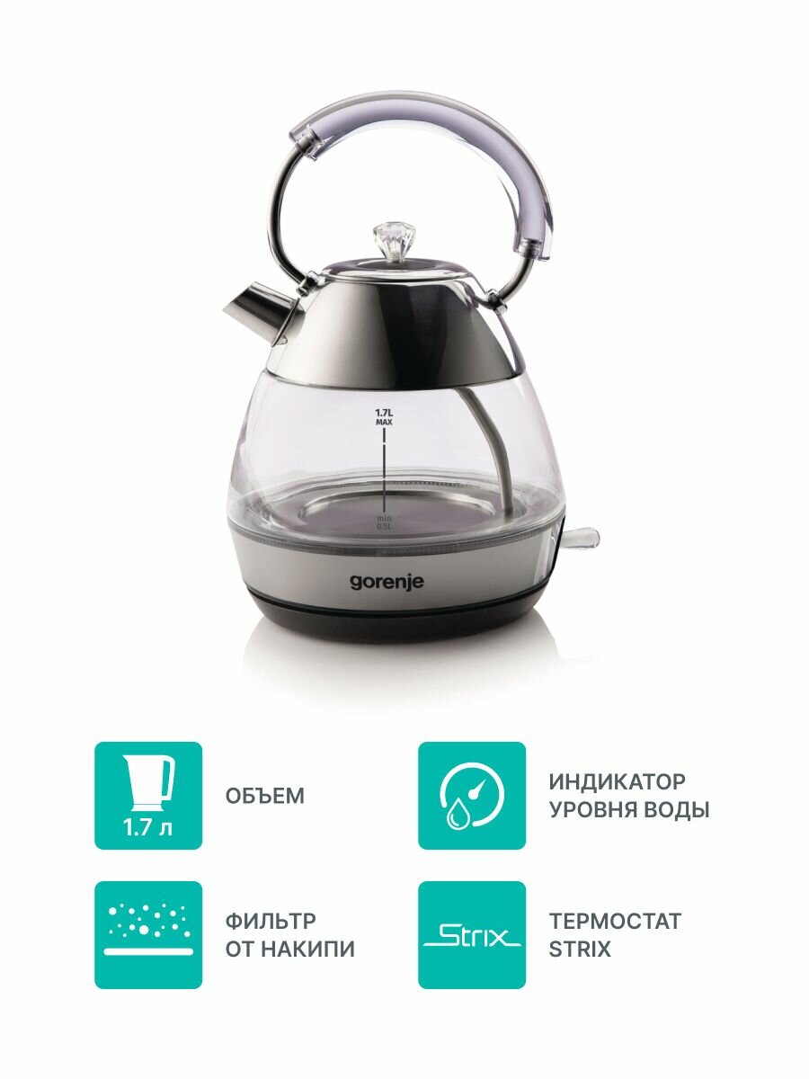 Type: kettle, body material: plastic, volume: 1.70 l, type of heating element: closed, additional functions: keeping warm, features: 360 degree rotation, water level indicator, cord storage compartment