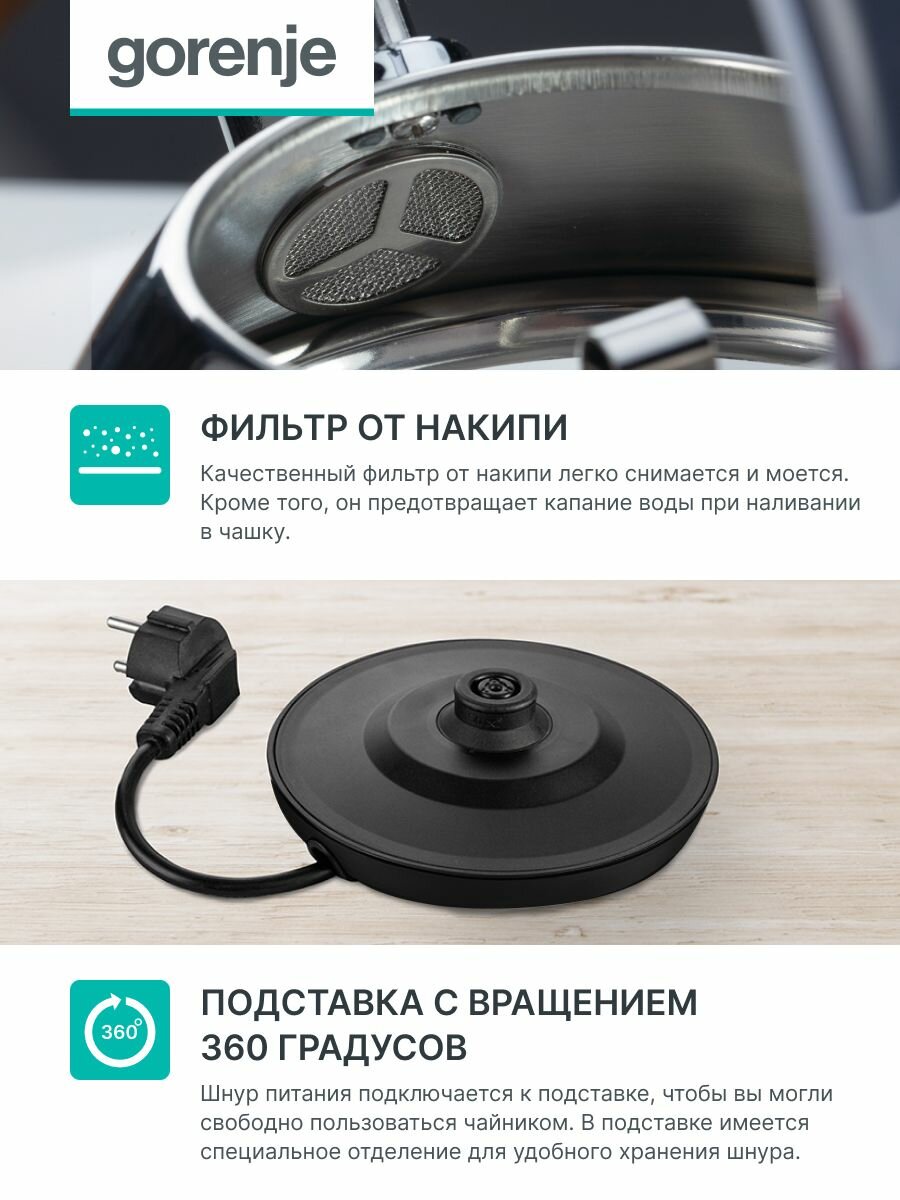 360 degree rotation, water level indicator, power indicator, cord storage compartment, filter, 360° stand rotation, cord compartment, Anti-scale filter, cord compartment