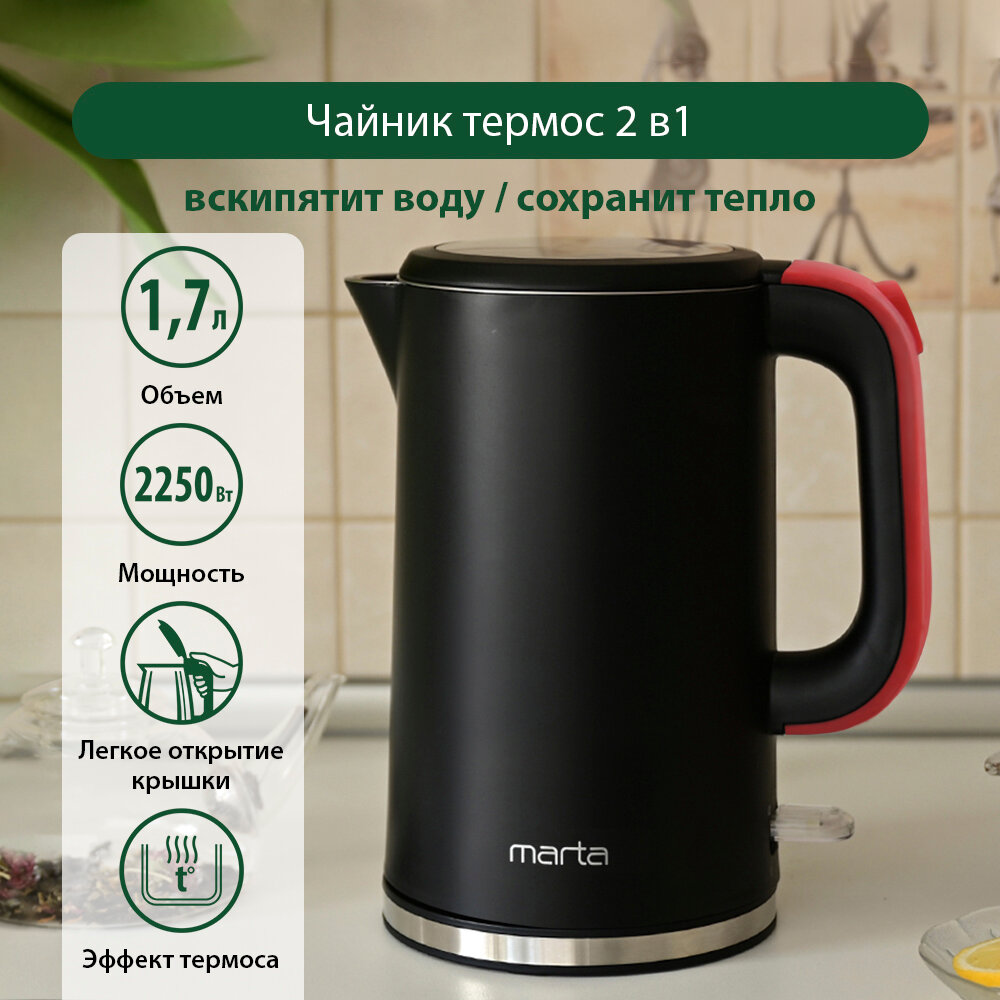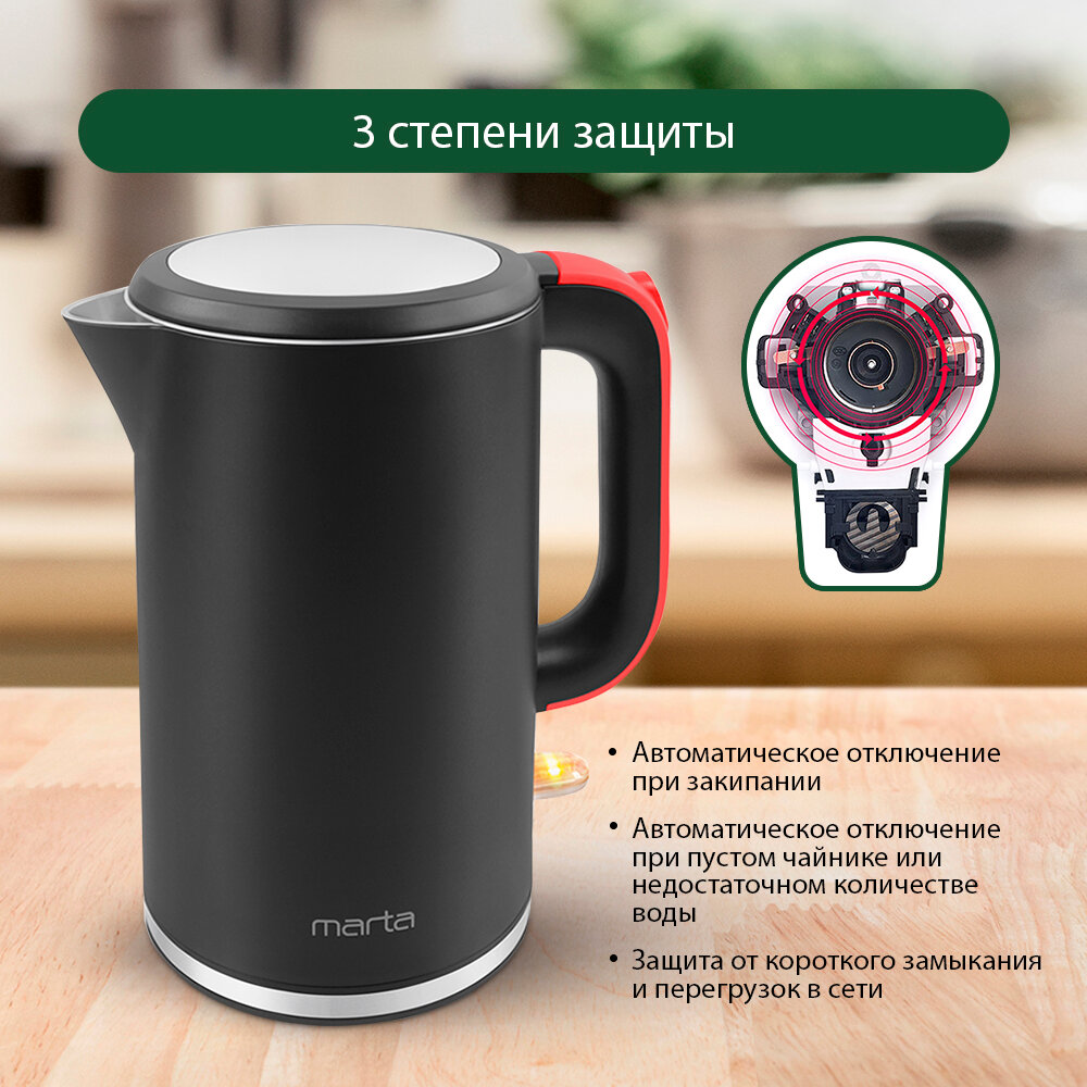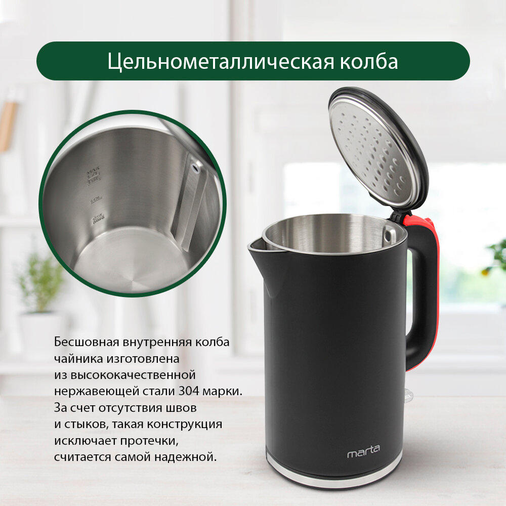Type: kettle, case material: metal, volume: 1.70 l, type of heating element: closed, features: 360 degree rotation, on indication