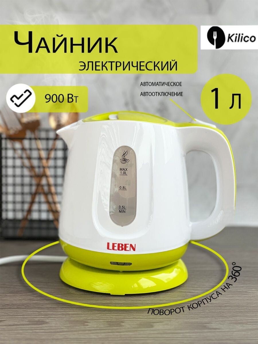 Type: kettle, body material: plastic, volume: 1 l, heating element type: open, features: 360 degree rotation, water level indicator, power on indicator