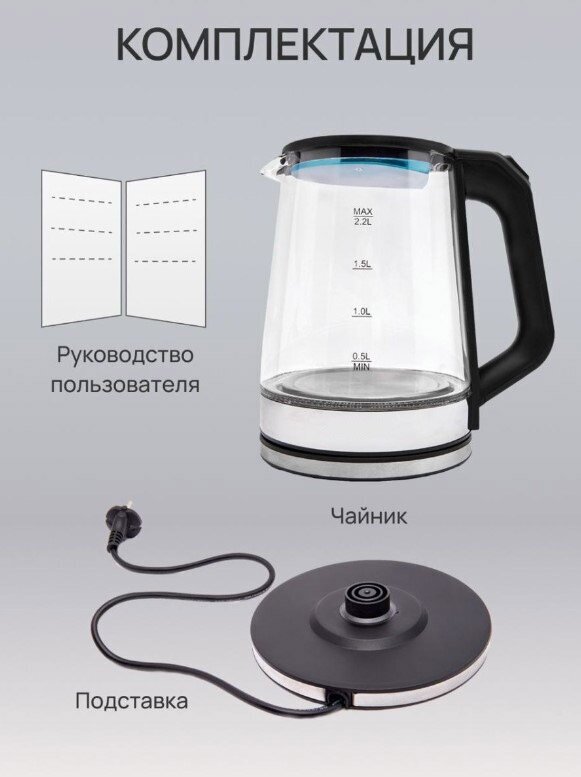 Type: kettle, body material: metal/glass, volume: 2.20 l, heating element type: closed, additional functions: long-term boiling, features: 360 degree rotation, water level indicator
