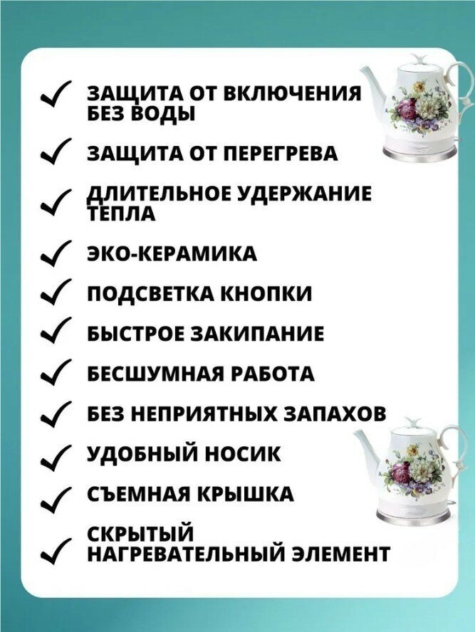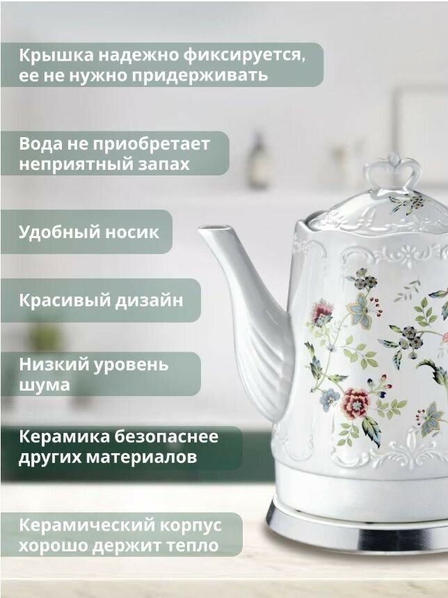 Electric ceramic kettle, home kettle, volume 1.7 l, overheating protection, for home, office, white, roses