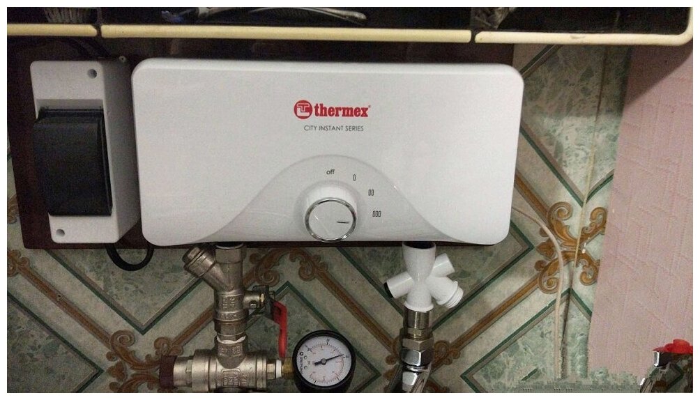 Water heater type: instantaneous, heating method: electric, installation: wall-mounted, vertical, horizontal, location: horizontal, connection: bottom, network voltage: 220, power consumption: 6.50 kW, depth